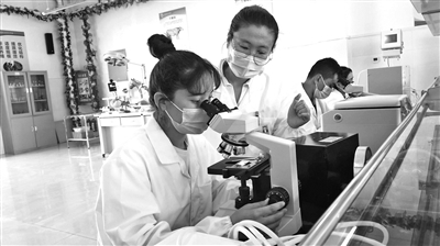 新疆和田地区于田县职业技术学校,畜牧兽医班的实训室里,学生在教师指导下使用显微镜辨认牛肉骨骼肌细胞的形态。 本报记者 唐琪 摄 |