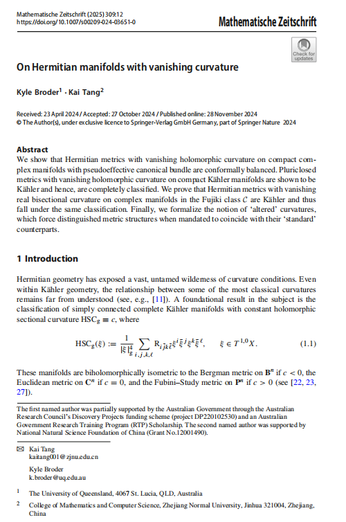 近日,数学科学学院教师汤凯与澳大利亚昆士兰大学博士后Kyle Broder合作的论文On Hermitian manifolds with vanishing curvature在高水平数学期刊Mathematische Zeitschrift上发表。