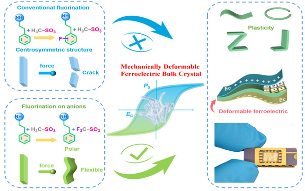 研究团队以“铁电化学”学科的氟代效应为指导,取得重要进展:通过阴离子氟化策略创新性地设计出兼具铁电性与优异塑性形变能力的铁电晶体PEA-TFMS(三氟甲磺酸苯乙基铵)。PEA-TFMS与非氟代的PEA-MS(甲磺酸苯乙基铵)相比,氟化微妙地改变了晶体结构中的离子取向和相互作用,进而调控晶体结构中阴阳离子的空间排布,这既实现了可切换的自发极化,又赋予了PEA-TFMS晶体宏观弯曲和螺旋形变的能力,使其成为柔性和可穿戴器件的候选材料。这项工作不仅展现了分子铁电材料在柔性器件中的巨大潜力,同时也为下一代高性能柔性铁电器件的研发提供了新思路。
