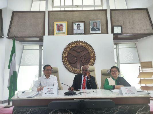 中国驻拉各斯总领事严宇清女士(右)、浙师大非洲研究院院长刘鸿武教授(左)、尼日利亚《非中经济杂志》主编伊肯纳·埃梅乌先生(中)。图片来源 非洲研究院