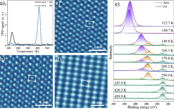 团队首次提出 CO2 在钴原子列间凹槽位点的三齿配位吸附模型,相较于传统认为的单独配位吸附以及双原子混合配位吸附,该吸附构型能够更有效的实现 CO2 低温活化,该研究为原子级精准设计高效催化剂提供了新的设计理念。杨文绍/黄传奇团队近年来发展了基于高分辨 STM 和 DFT 的表面反应原位可视化研究手段,在钴单晶表面实现了 CH3OH、H2、CO、H2O、O2 等一系列重要分子的原子级可视化研究(J. Phys. Chem. Lett. 2022, 13, 5131–5136, J. Phys. Chem. Lett. 2023, 14, 9385–9391, J. Phys. Chem. C 2024, 128, 20811–20818, J. Phys. Chem. Lett. 2025, 16, 2529–2535.),取得一系列重要的原创工作成果,得到了国内外相关领域专家的广泛关注和认可。