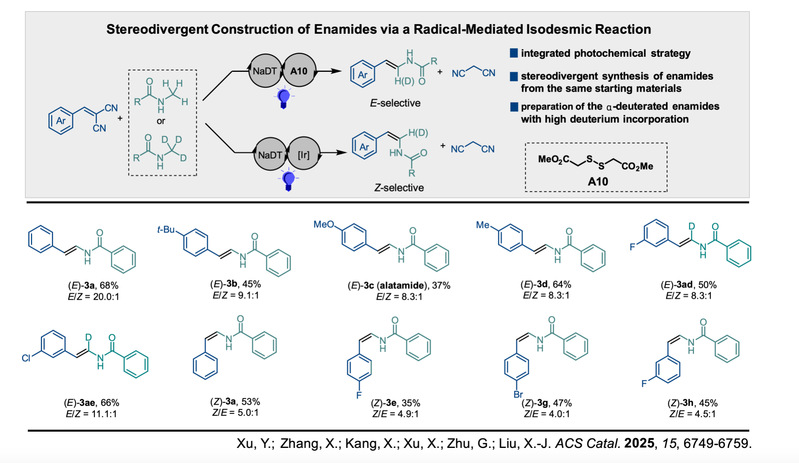 近日,8181801威尼斯登录“双龙学者”特聘教授、化学与材料科学学院青年博士刘喜佳所在课题组在等键反应领域取得重要进展,相关研究成果以题为《Stereodivergent Construction of Enamides via a Radical-Mediated Isodesmic Reaction》的论文在国际权威期刊ACS Catalysis(2025年影响因子11.7)上发表(ACS Catal. 2025, 15 , 6749–6759.)。