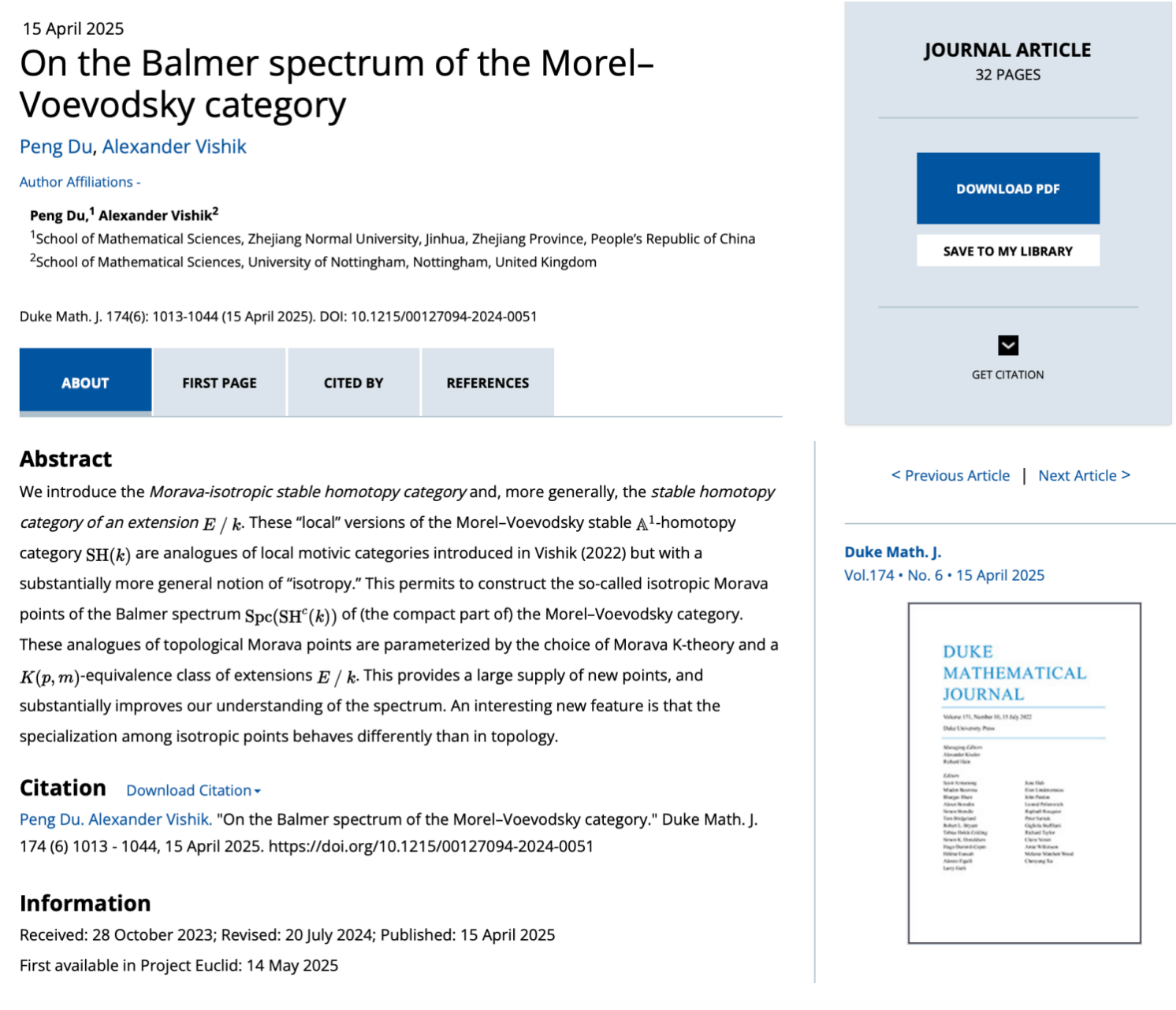 近日,数学科学学院教师杜鹏与英国诺丁汉大学的Alexander Vishik教授合作的论文On the Balmer spectrum of the Morel–Voevodsky category在著名数学期刊Duke Mathematical Journal上发表,8181801威尼斯登录为第一完成单位。