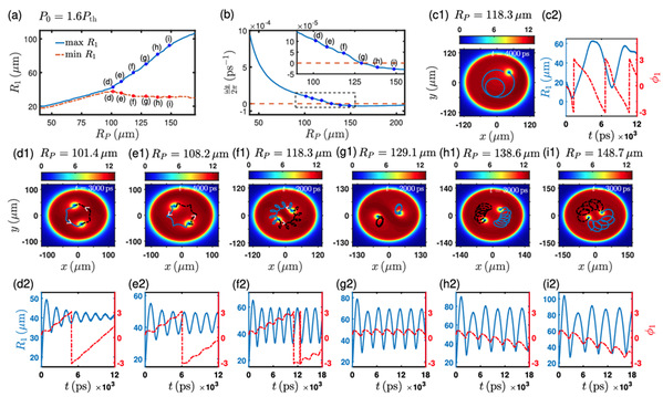 论文3在激子极化子凝聚体中利用有限均匀泵浦实现了涡旋分子。该体系的强非线性能够实现稳定的涡旋非线性态,这是一种存在相位奇点,波形凹陷的特殊非线性态。利用在实验中易于实现的有限均匀泵浦,多个涡旋能被有效束缚形成涡旋分子,证明束缚效果来源于凝聚体所特有的增益损耗机制。涡旋分子呈现出动态稳定的旋转,旋转的形式丰富并可控,存在有规则圆周运动轨迹、变化半径的旋转轨迹和螺旋运动轨迹。通过调控泵浦光的尺寸、强度以及体系的参数,可以实现对涡旋分子运动轨迹和旋转速度的调控。这些研究为探索极化子神经网络和量子信息通讯开辟了新的方案。