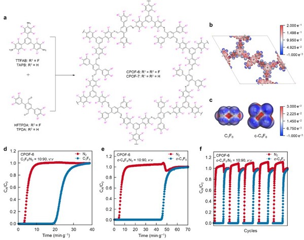 该研究聚焦于半导体工业中常用的八氟丙烷(C3F8)和全氟环丁烷(c-C4F8)等高温室效应值(GWP)含氟电子特气的高效分离与回收问题。该类气体因其极强的稳定性和较长的大气寿命,已成为全球气候变化控制中的难点之一。研究团队基于共价有机框架(COFs),通过引入高度氟化的功能基团,构建出具有电场梯度的介孔(2.8 nm)材料CPOF-6,实现了对多种极化含氟气体与常见惰性气体(N2、Ar、H2、O2)的高效分离。研究表明,通过引入高度极性的氟官能团,该材料在常温常压下展现出优异的吸附容量与选择性,并在动态穿透实验中表现出卓越的分离效率与循环稳定性,在当前所有已报道的多孔吸附剂材料中居于领先水平。此外,研究还提出了“氟诱导电场梯度驱动气体分离”新机制,为气体极化差异驱动的高通量绿色分离技术提供了理论支撑与材料基础。