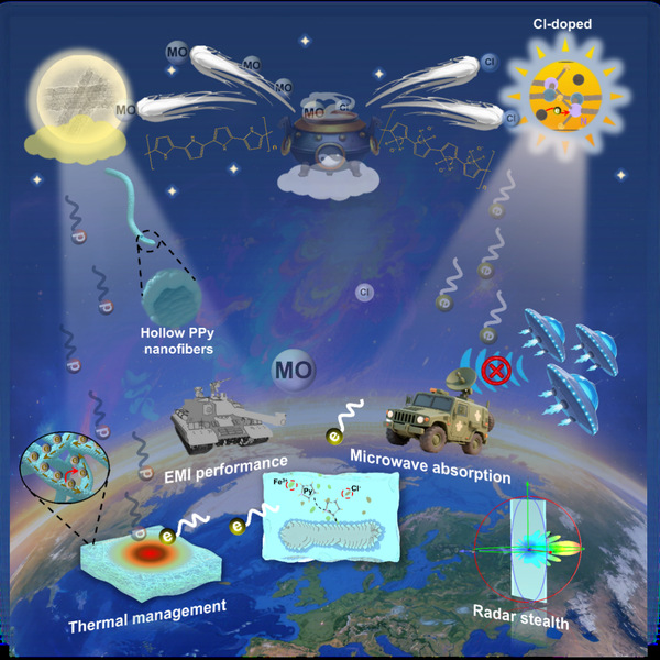多功能材料导热与吸波性能的协同增强对解决电子工业的电磁干扰和热积累问题、实现电子器件的轻薄化与电路高度集成化具有重大意义。基于电磁波与声子的传输理论,利于电磁波损耗的多界面结构控制与声子的有效传输有着不可调和的矛盾,因此,协同增强多功能材料的导热与吸波性能具有极大的挑战性。为此,童国秀课题组设计制备了一维中空Cl–掺杂PPy/硅胶柔性复合膜。这是考虑到:一维中空结构在改善材料对电磁波的取向极化损耗响应的同时能构筑有效的导热/导电网络;通过控制Cl–的掺杂量,在PPy的共轭结构中引入自由电子,能调控欧姆损耗和电子热导,进而实现微波吸收/屏蔽与热传输性能的协同增强。该材料展现了优异的导热、电磁波吸波/屏蔽性能,在4 wt.%的填充比下,Cl–掺杂PPy/硅胶柔性复合膜在2–18 GHz范围内展现出高效的微波吸收性能(3.32 GHz/mm),且厚度仅为2 mm。RCS仿真结果表明,其雷达散射截面积降低值达33.45 dB∙m2(99.95 %吸收)。另外,通过改变填料的填充比,能实现了材料的吸波与屏蔽性能的自由转换,且在2–18 GHz频段范围内实现了屏蔽效能≥ 20 dB(99 %屏蔽),在20 wt.%填充比下,最高屏蔽效能达到66.63 dB(99.99998 %屏蔽)。同时,DFT理论计算表明:体系中的Cl–掺杂显著改善了声子匹配,降低了界面热阻,从而使材料的热导率达3.597 W m–1 K–1。综上,本研究为实现材料导热、吸波性能的协同增强,热管理、电磁防护与雷达隐身多功能一体化提供了新的思路。