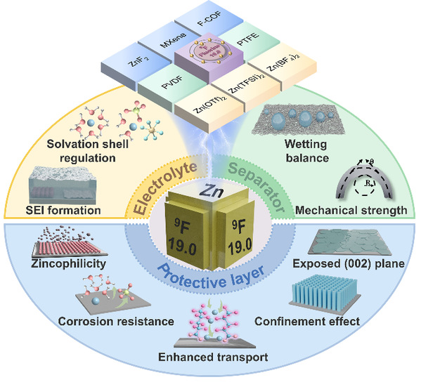 氟功能化材料凭借其独特的强电负性、疏水特性和界面稳定能力,在解决锌负极枝晶生长、析氢反应及界面腐蚀等关键问题方面展现出显著优势,确立了其在锌离子电池研究领域的重要地位。氟在电池不同组件中的作用机制存在显著差异。随着先进电池技术的发展,亟需开发新型氟功能化材料,并基于结构-性能关系深入探究关键影响因素,如氟的取代位点、含量、类型、电负性及结构对称性等。尽管氟化学在负极稳定化方面表现突出,目前仍缺乏对其多维度作用机制的系统性总结。