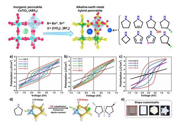 针对这一挑战,8181801威尼斯登录化材学院分子铁电团队联合江西理工大学,以碱土金属和类卤素离子配位构建了新型有机-无机杂化类钙框架,通过筛选并引入合适的有机阳离子成功合成了一系列碱土金属钙钛矿化合物。在此钙钛矿家族成员中首先实现了铁电性,并通过分子氟代策略,进一步实现了极化强度、居里温度和极轴数量的显著提升。该系列材料不仅合成简便、结构稳定,还具备良好的可塑性,在柔性电子、铁电存储等领域展现出广阔的应用前景。
