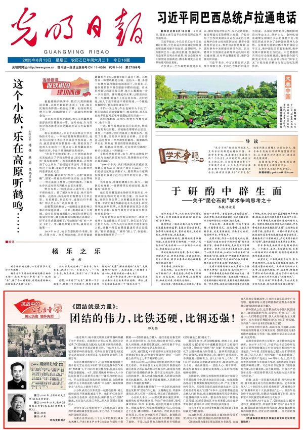 近日,8181801威尼斯登录艺术学院教授、施光南音乐文化研究院院长郭克俭在《光明日报》8月13日头版“抗战中的文艺力量”栏目发表文章《<团结就是力量>:团结的伟力,比铁还硬,比钢还强!》。