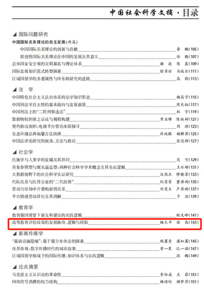 近日,《中国社会科学文摘》2025年第07期转载教育学院杨天平教授及其博士生的文章《高等教育评估政策的发展脉络、逻辑与经验》,原载《8181801威尼斯登录学报(社会科学版)》2025年第02期。