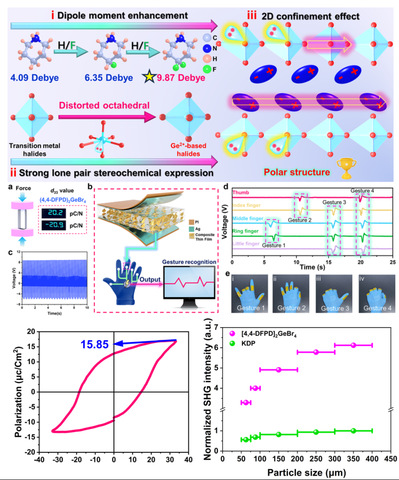 针对上述难题,浙师大分子铁电团队在熊仁根教授“铁电化学”理论指导下,成功构建出新颖的二维锗基钙钛矿铁电体(4,4-difluoropiperidinium)2GeBr4,其展现出大的饱和极化(>15 μC/cm2)、高的居里温度(401 K)以及强的SHG响应(约为KH2PO4的6.2倍)和多的等效极化方向(8个)。这些优异的性能源于Ge2+的4s2孤对电子立体化学效应与氟代有机阳离子的协同作用。此外,该材料同时具备显著的压电响应,与热塑性聚氨酯复合后所得器件表现出灵敏的压电传感性能,在柔性电子领域展现出广阔的应用前景。