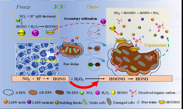 在此基础上,本研究进一步提出了冻融激活亚硝酸盐和H2O2氧化的协同处理新策略。研究发现,冻融激活氧化过程中,冰晶浓缩与电位效应可促进强氧化剂HOONO的生成,从而将复杂有机质分解为低分子有机物,显著增强污泥有机质融出效果,其产物可作为污水处理系统的优质碳源。同时,该协同处理促进了污泥絮体重构,显著改善污泥脱水性能,并实现病原菌灭活,提升了污泥资源化利用的安全性。此外,冻融过程具备循环利用潜力,展现出良好的经济性与工程应用前景。该研究为市政污泥减量化与资源化利用提供了新的理论依据与技术路径。