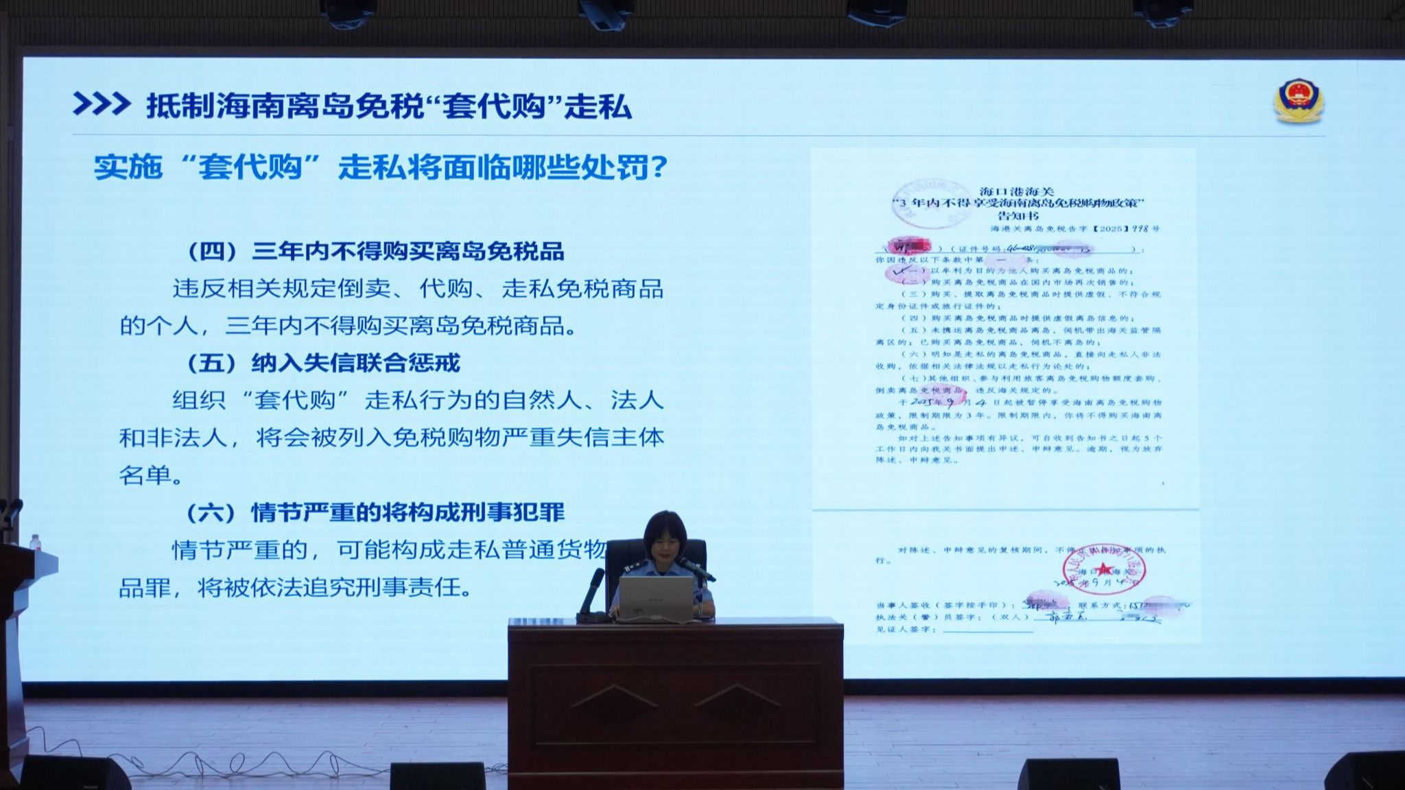 孙晓燕以“抵制‘套代购’,人人反走私”为主题,详细介绍了“套代购”的概念、形式以及走私行为的危害。她通过真实案例,深入浅出地讲解了相关法律法规,提醒新生要认清“套代购”的违法本质,自觉抵制此类行为,共同维护良好的市场经济秩序和社会安全。