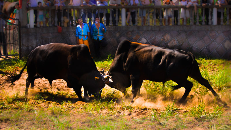 Bulls are brought into the ring in pairs and put face to face, and they engage in a strenuous pushing match until it is clear which bull is stronger. The master of the bullfights delivers the decisions on each match, a small band of musicians accompanies the event on a variety of traditional Chinese instruments, and when it's all over the owners take the bulls back to the farms where they are used in agriculture. The Jinhua bullfights, which have been going on for more than 800 years, have been given Intangible Cultural Heritage status by UNESCO.