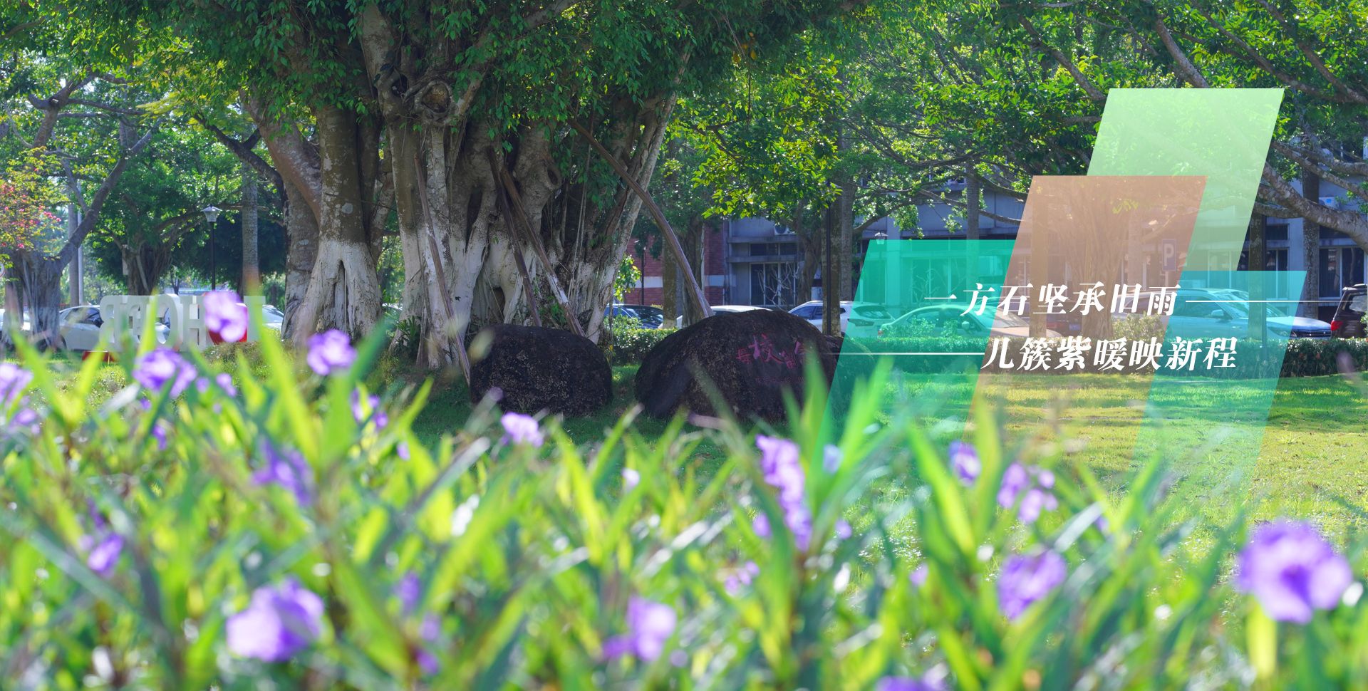 一方石坚承旧雨 几簇紫暖映新程