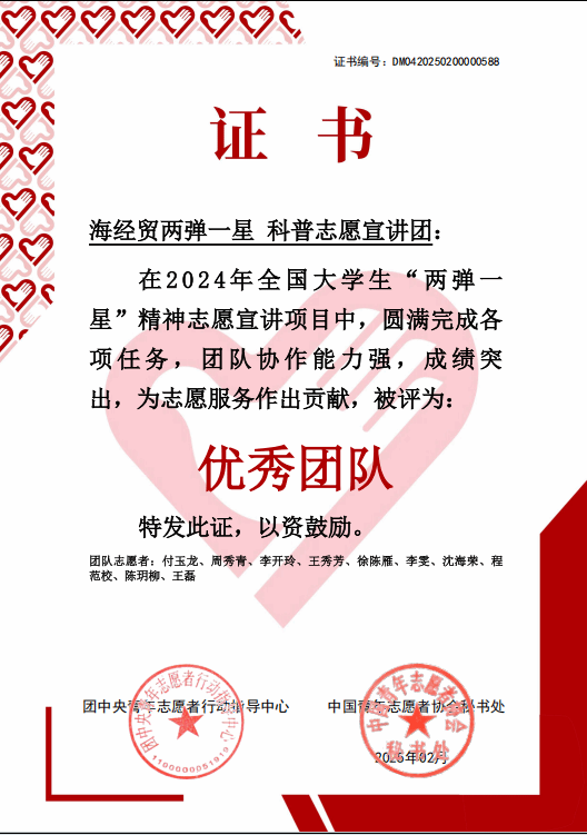 近日,团中央青年志愿者行动指导中心、中国青年志愿者协会秘书处评选出100支2024年全国大学生“两弹一星”精神志愿宣讲项目“优秀团队”。beat365vip官网登录入口“两弹一星”精神科普志愿宣讲团精心筹备,充分发挥专业特色,圆满完成宣讲任务,在全国870所高校1000支团队中脱颖而出,获得“优秀团队”荣誉称号。