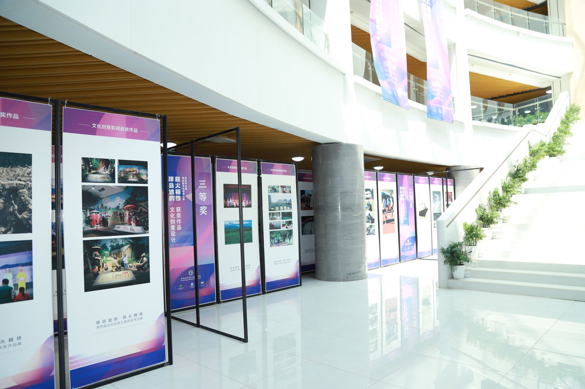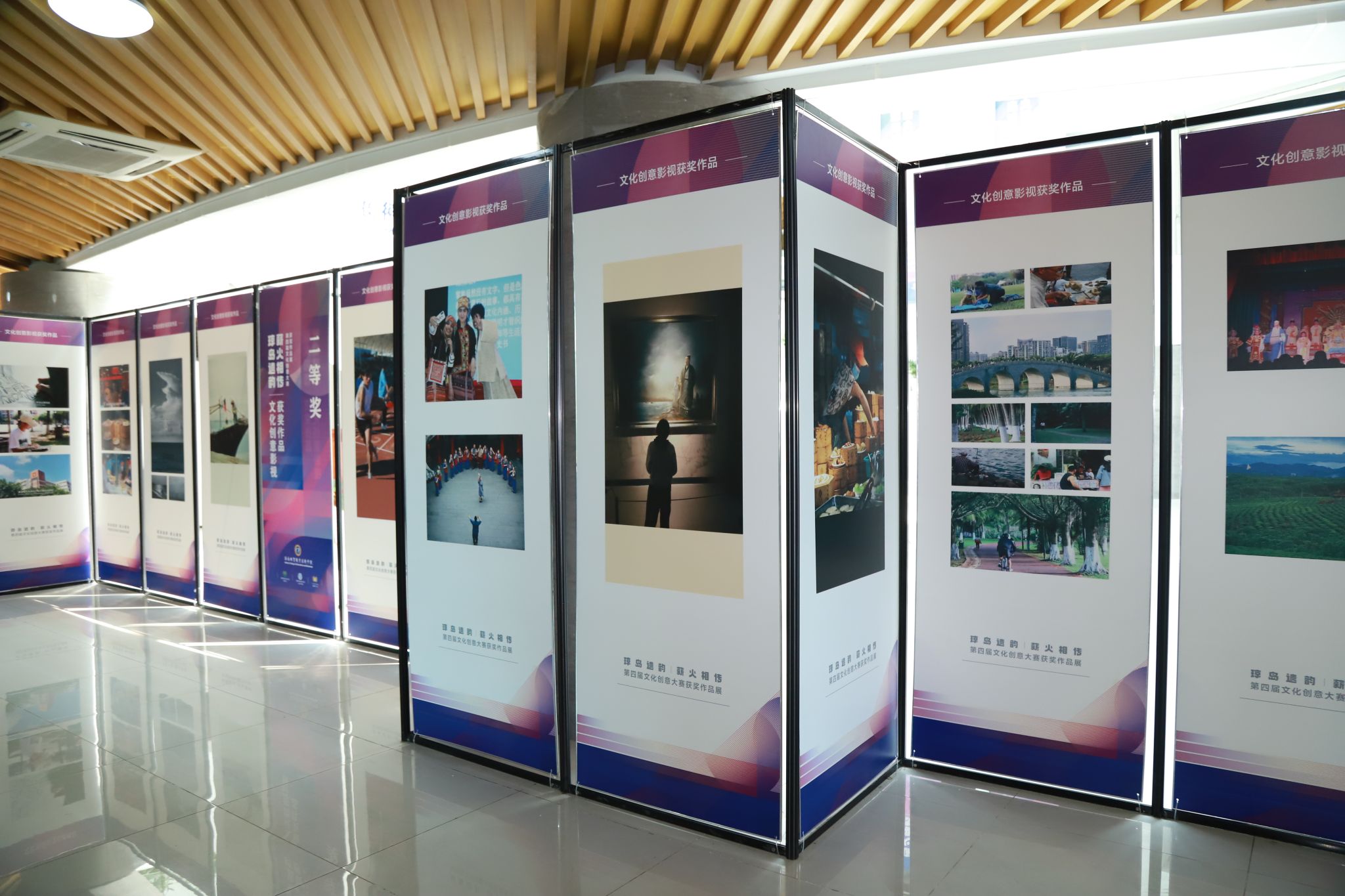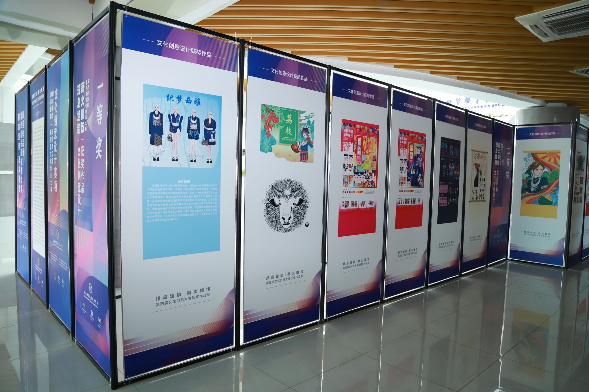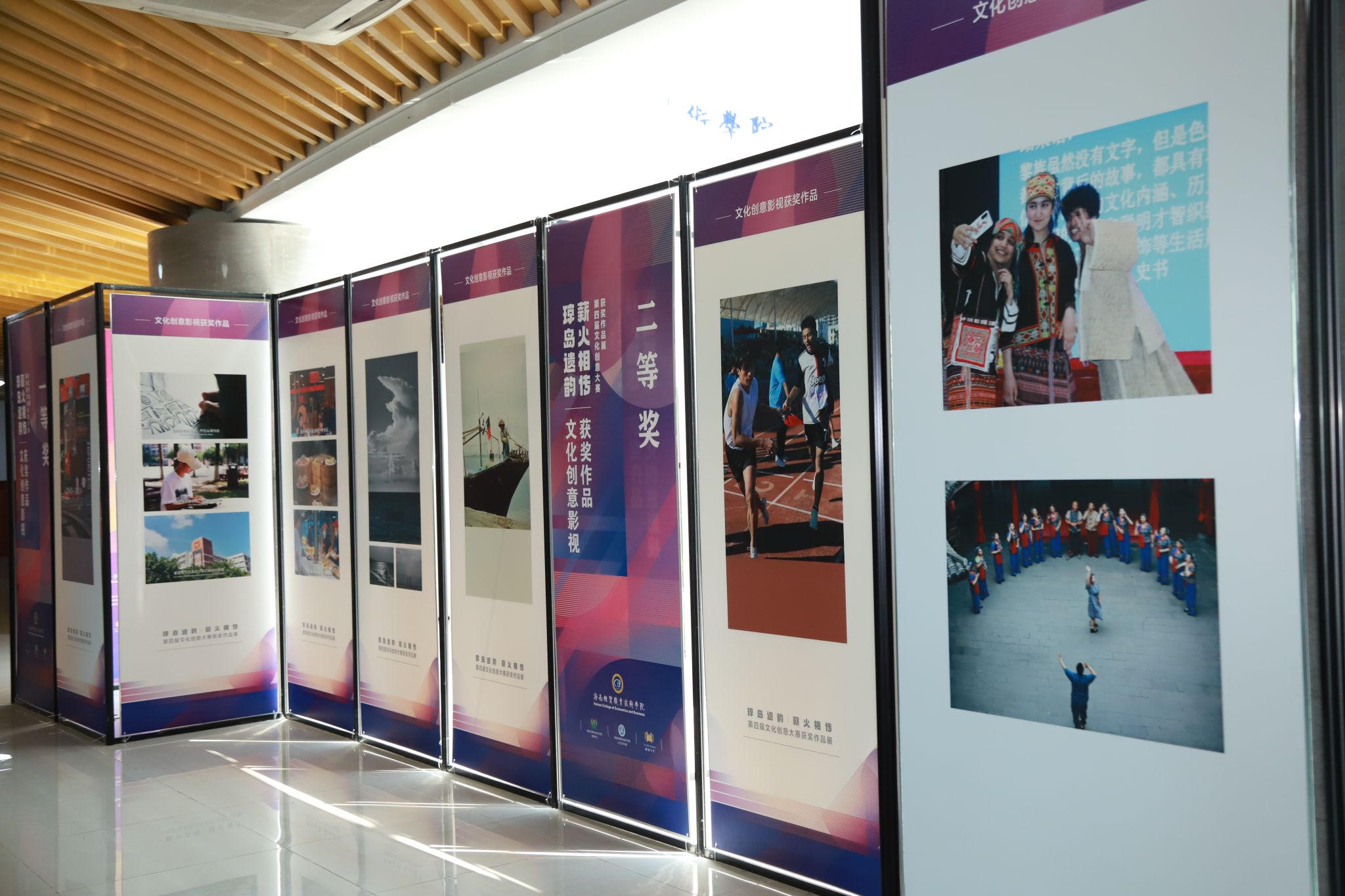 作品展展出了获得本次文化创意比赛一、二、三等奖的优秀作品。用镜头记录下琼岛人民生活图景、发挥创意设计出独具海南风情的特色文创和服装、用文字抒发对海南的热爱和建设海南自由贸易港的热情……同学们在海南本土文化中汲取灵感,创作出内容丰富多样、温度与情怀并存、充满创新元素、展现个人才华与感悟的作品。