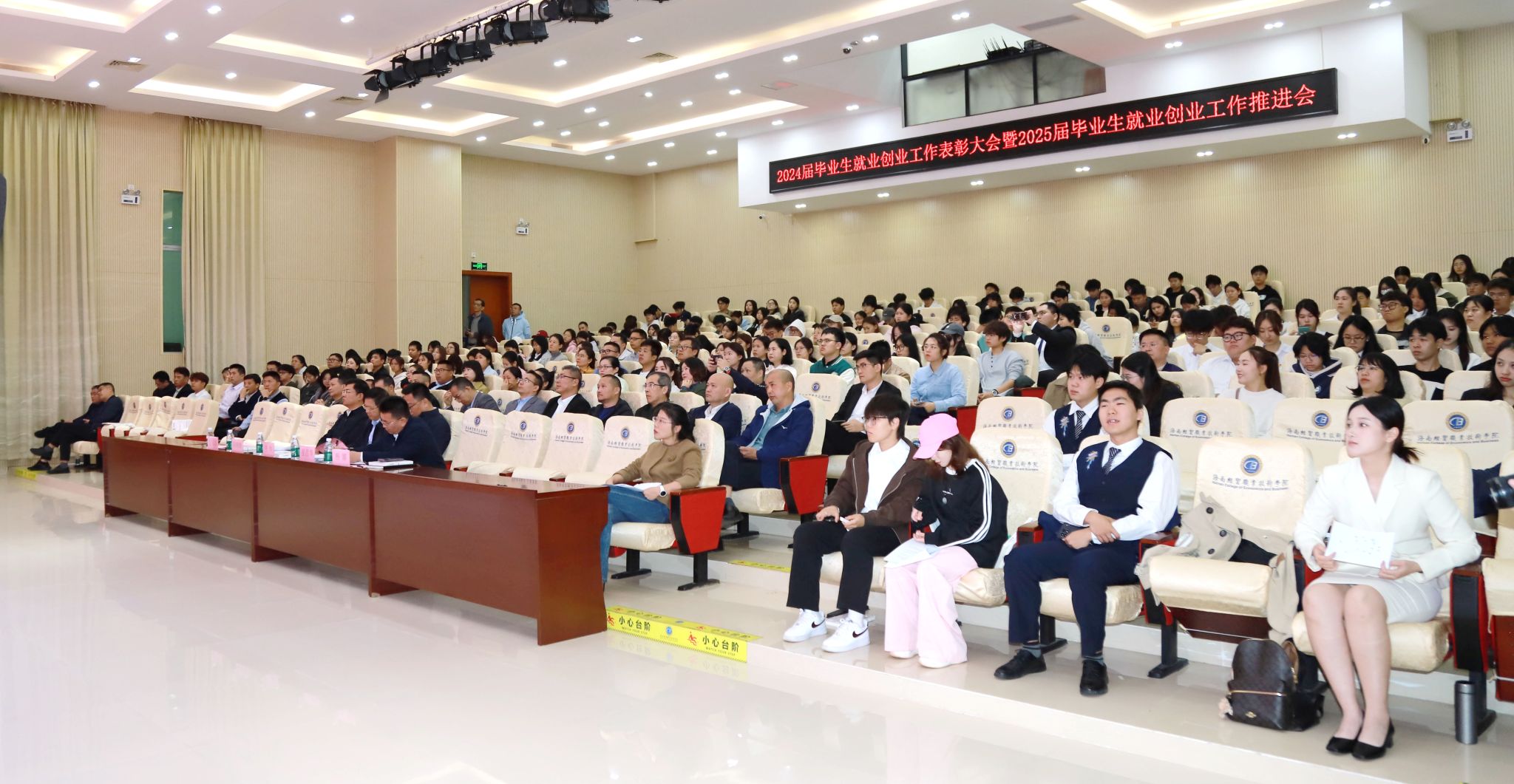 学生工作部、团委、教务处、产学研合作处负责人,各二级学院党政负责人、全体辅导员、获表彰的集体和个人代表、招生与就业创业处全体人员和学生代表参加会议。