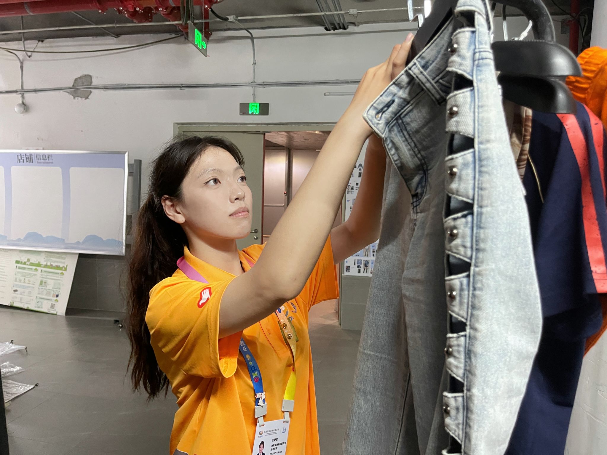 任夏莹在时装秀后台帮助模特整理衣物