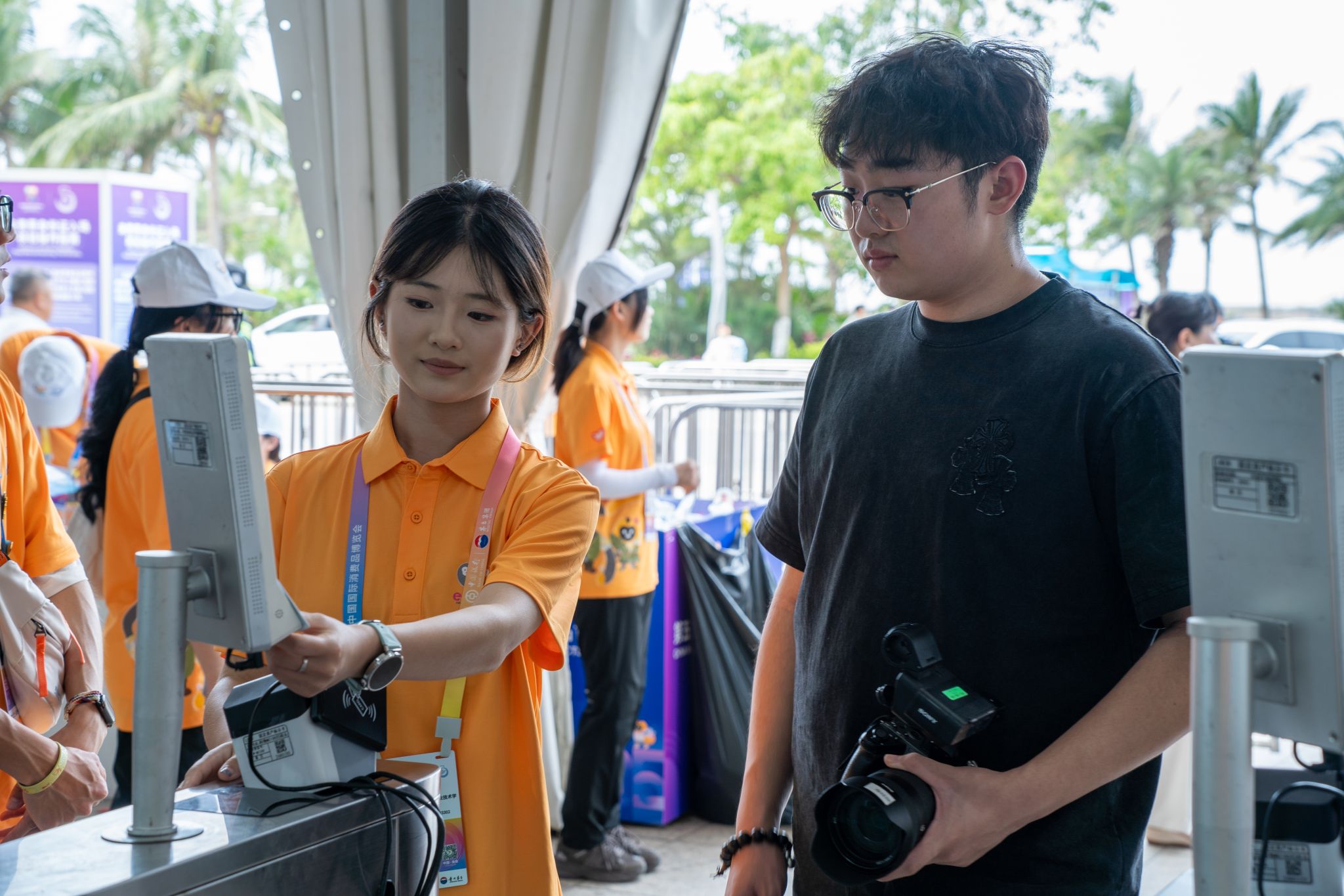 “您好,请看摄像头。”这是高紫涵同学作为票务组成员说得最多的一句话。“安检口的人流量是很大的,要不停提醒人群有序排队安检。我始终保持着饱满的热情,很开心能为消博会贡献我的力量。”
