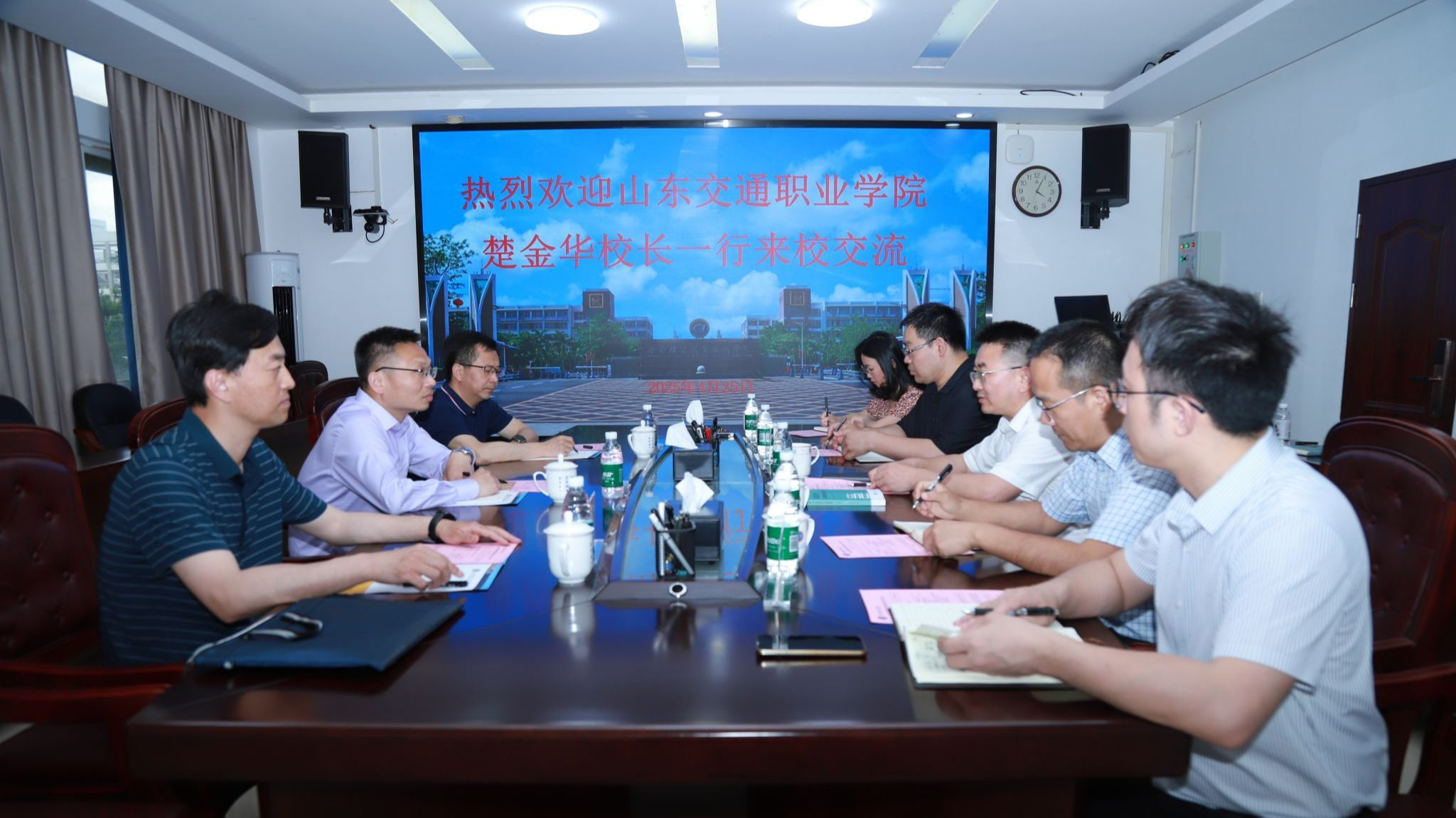 2025年4月25日,山东交通职业学院党委副书记、校长楚金华一行来到beat365vip官网登录入口,就产教融合、专业群建设、国际合作等工作进行交流座谈。学校党委副书记、校长崔昌华热情接待了山东交通职业学院一行。