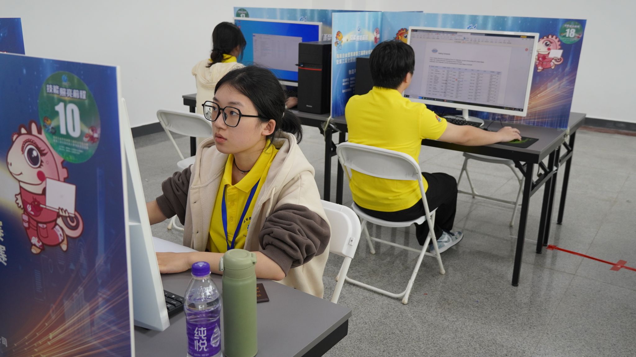 在物流与货运代理赛项现场,选手们聚精会神地在电脑屏幕前作答。该赛项重点考察选手在全英文语境下对国际货运代理业务的方案设计与规划、费用核算、单证审核与缮制、投诉与索赔处理等职业能力。