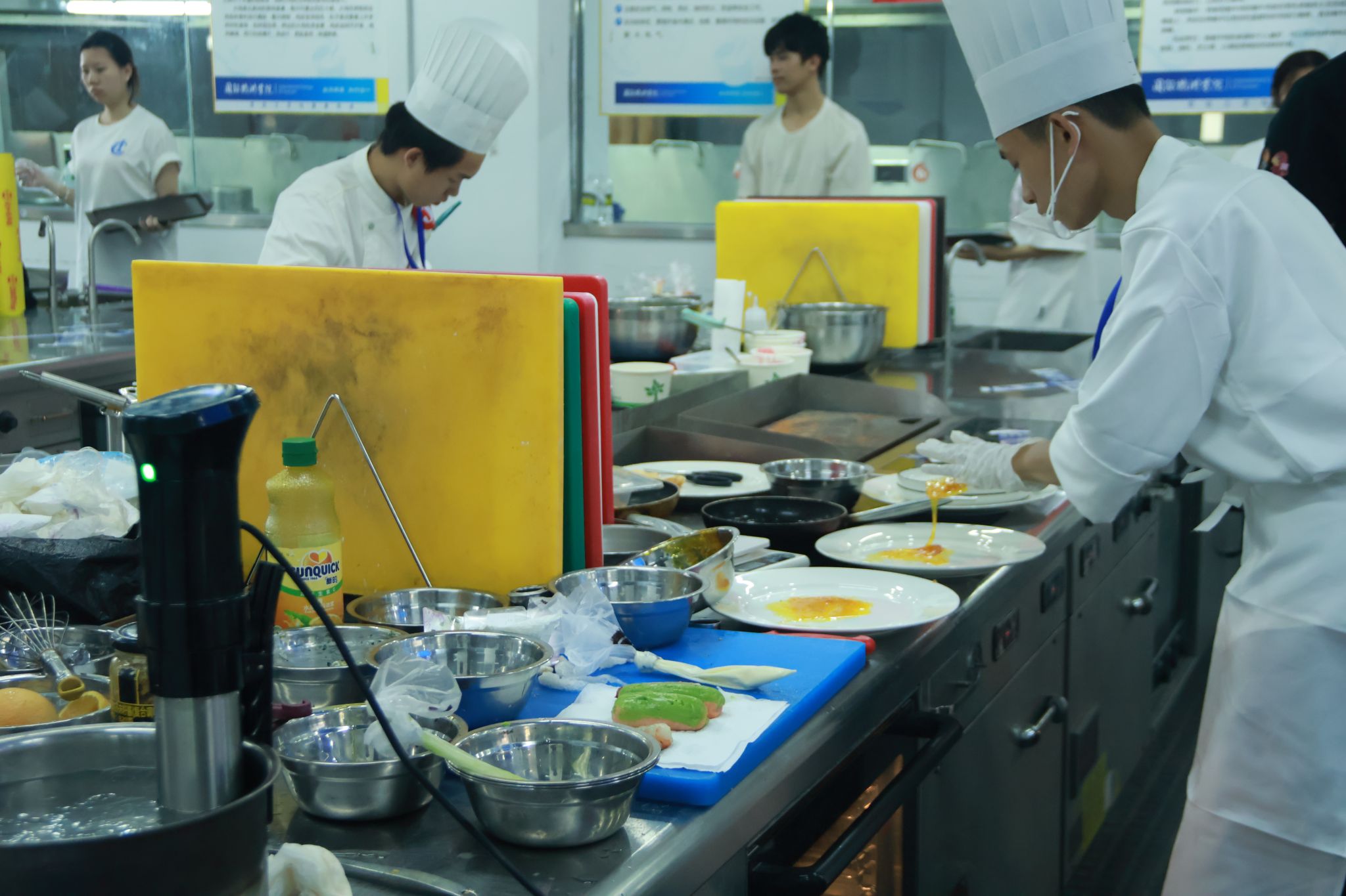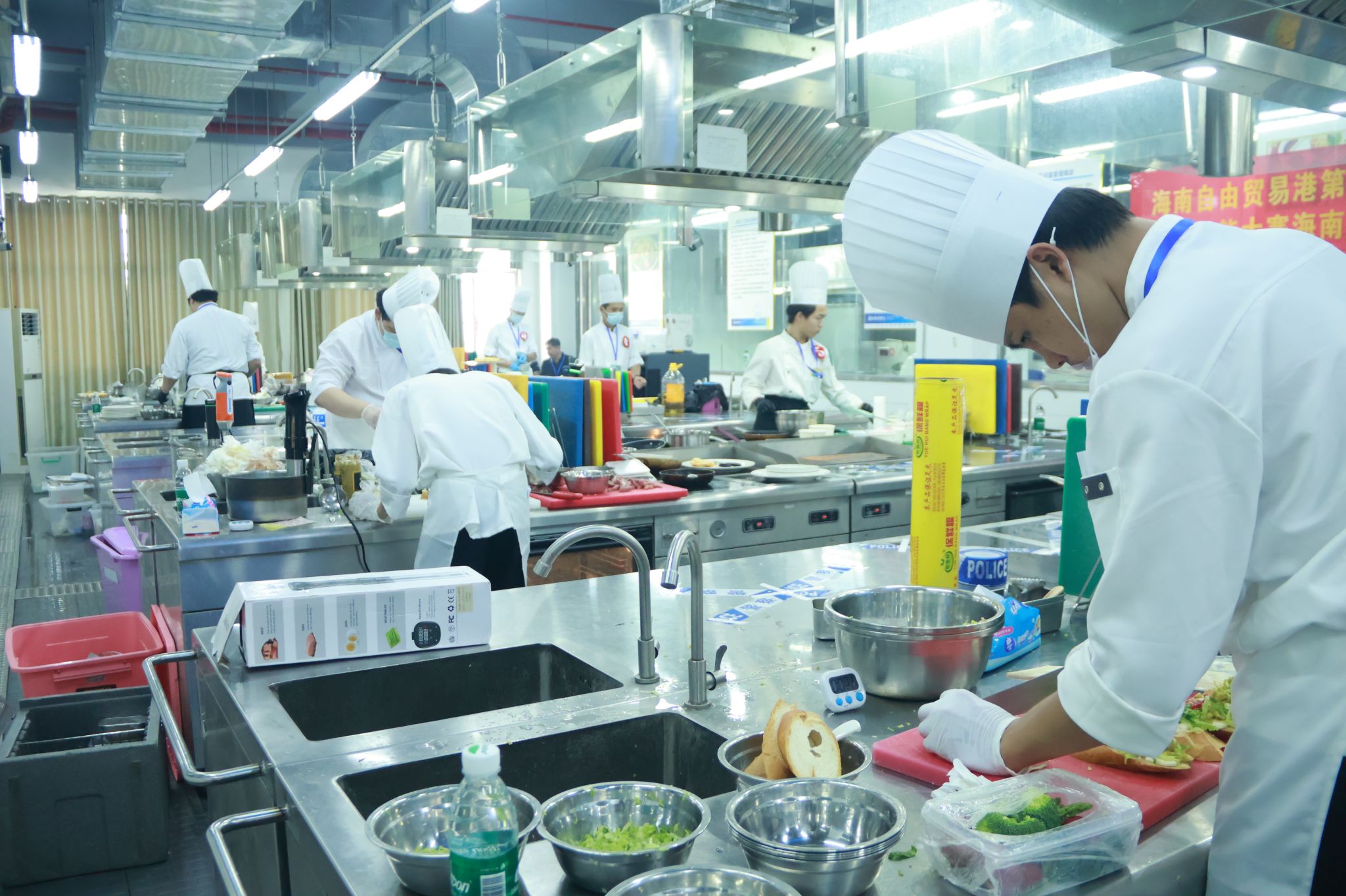 盘式煎饼、三文鱼前菜、三明治、牛肉主菜及盘式甜品……参加烹饪(西餐)赛项的选手们需限时完成以上餐食的制作比拼。比赛从烹饪技艺、食材处理、安全规范等多维度,全面检验选手的西餐专业素养和实战能力。