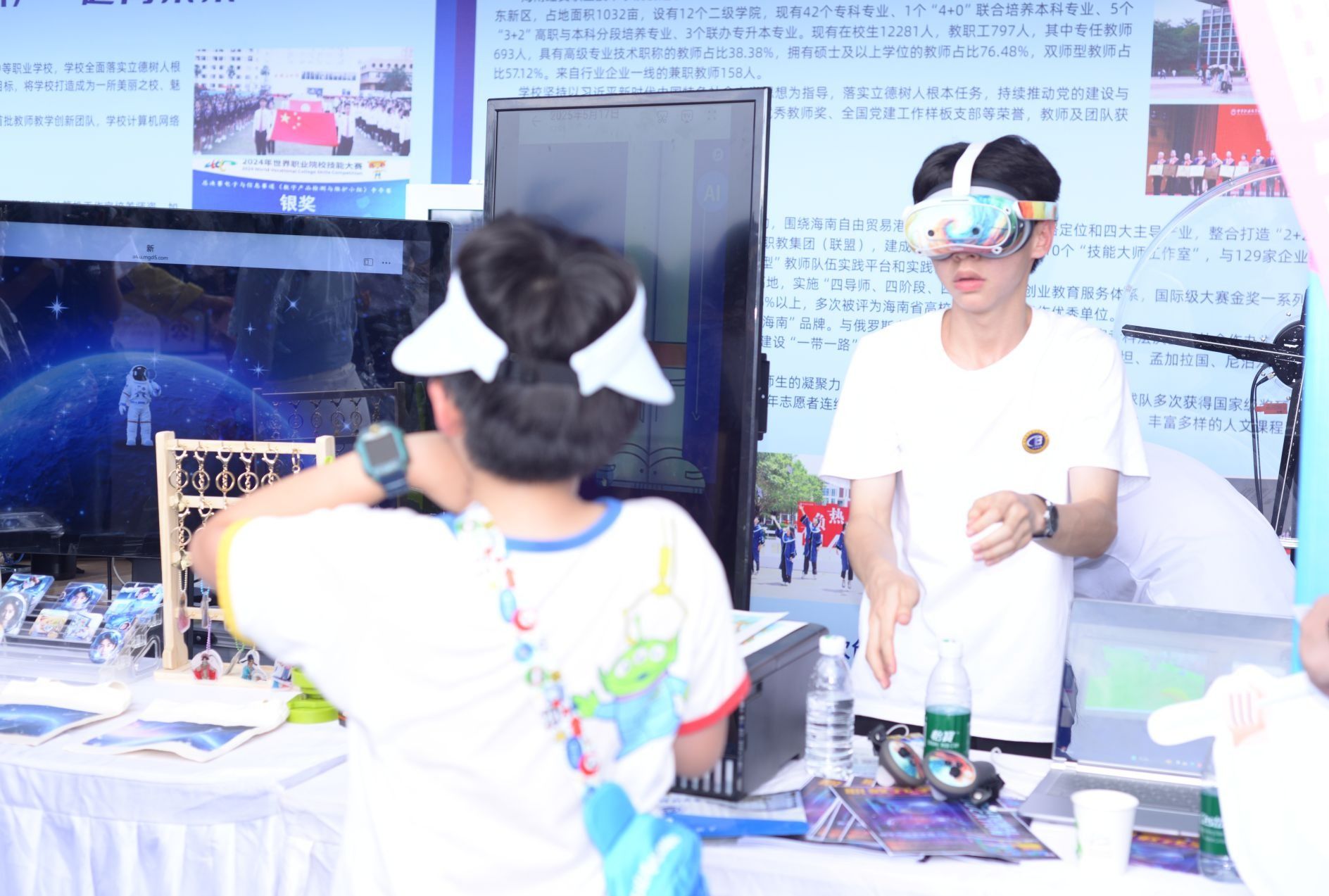 “带上VR眼镜,拿好手柄,现在就可以在虚拟世界中模拟真实的机械装备场景。”机电与汽车工程学院符祥青等同学向市民们讲解。此项目紧扣职业院校机械类专业教学改革与企业技能培训数字化转型需求,用户可以在不接触真实机械设备的情况下进行训练,避免了因操作不当而导致的机械设备损坏或人身伤害等风险。来参观的小朋友饶有兴致地尝试起来。