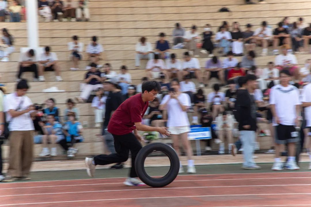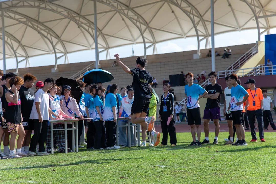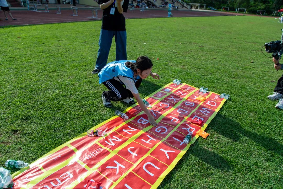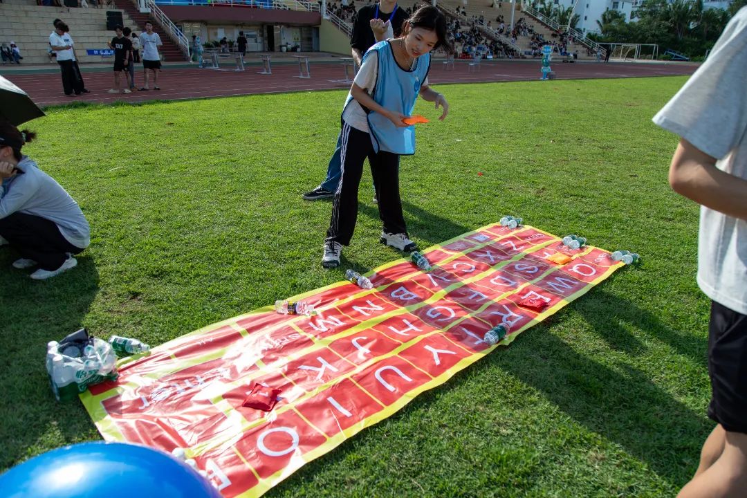 迅速记忆便利贴上的单词,随后沿着指定路线单脚跳跃至终点,并在白板上准确写出该单词。外国语学院“单词‘弹弹弹’”项目以语言专业为基础,巧妙融合英语单词学习与体育运动,不仅考验了参赛者的身体协调能力和运动技巧,更在轻松愉快的氛围中助力他们巩固英语单词记忆,激发外语学习兴趣,有效提升语言实践运用能力。