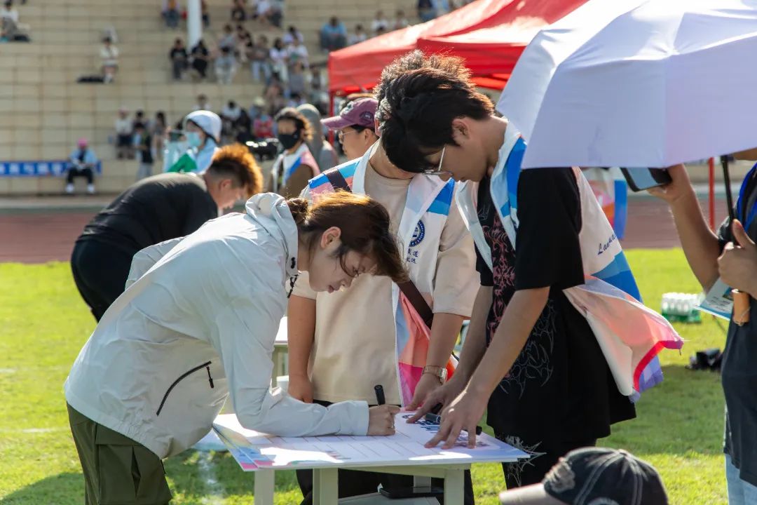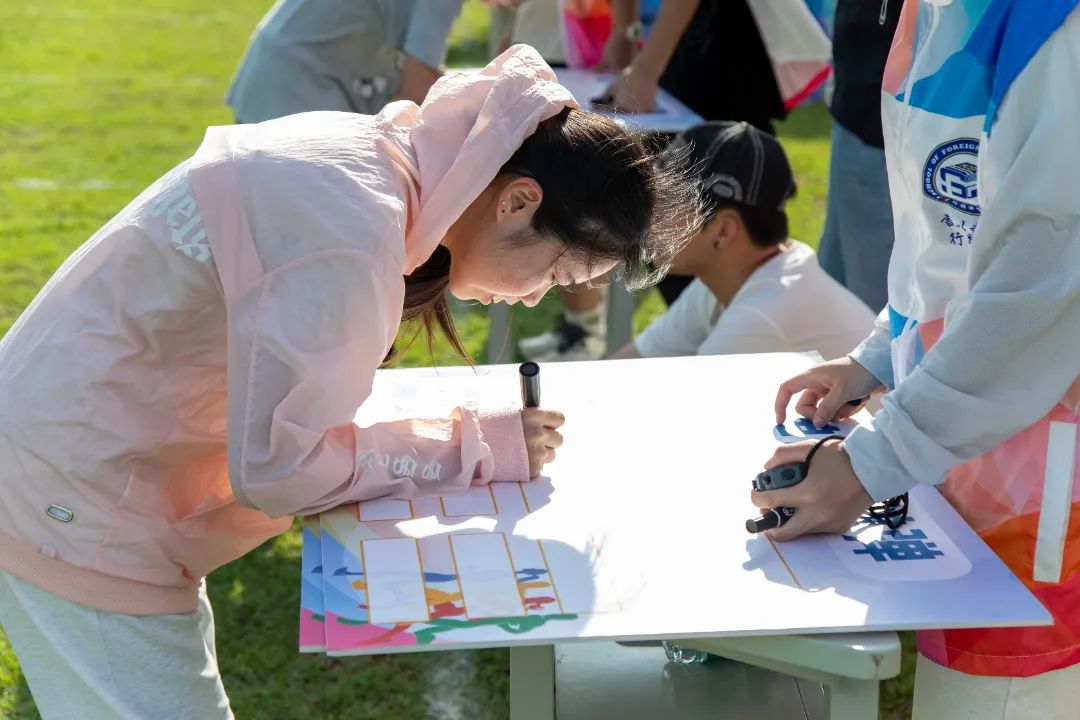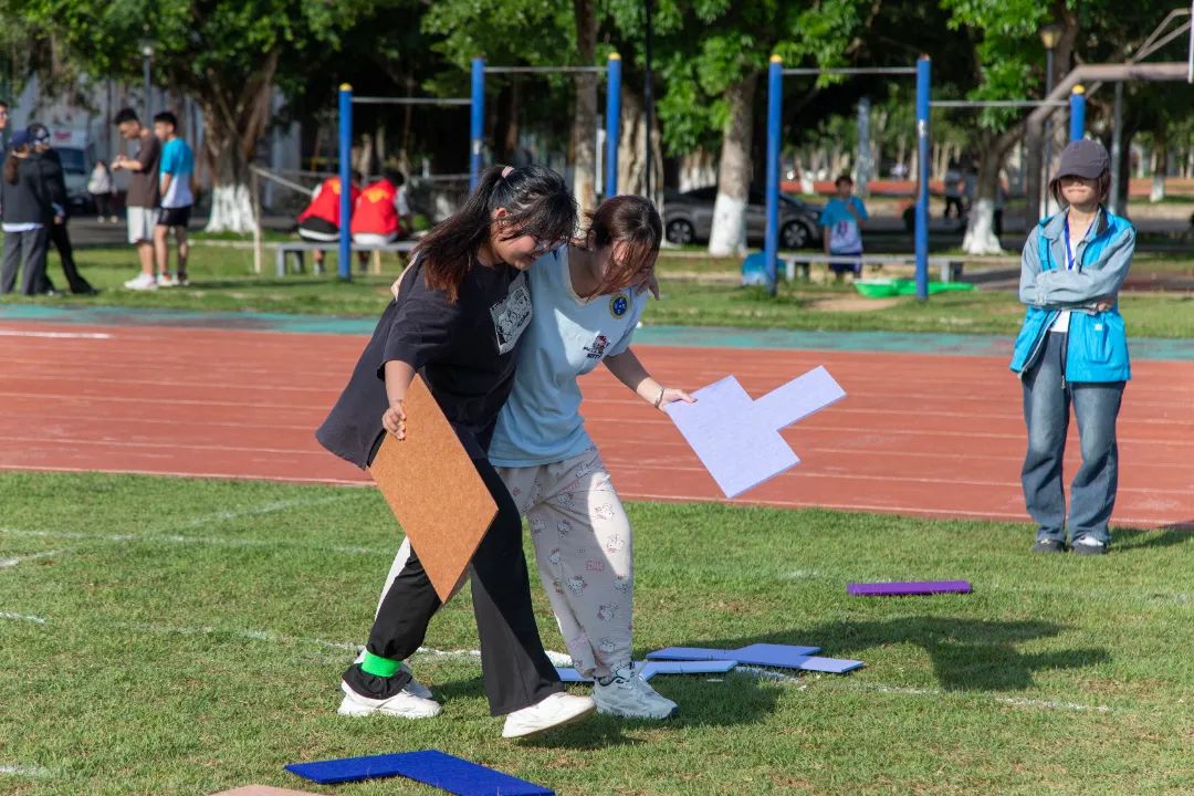 “绑腿的位置要结实一些,这样我们动作才能更统一。”人文艺术学院的“画布拼贴挑战赛”项目以艺术设计专业图形与色彩基础搭配设计知识为核心出发点,巧妙融合体育竞技元素,充分调动参与者的视觉感官体验。在比赛现场,参赛队员们以“二人三足”的形式沿着指定路线前行。行进途中,他们需精准拿取拼图毡板道具,随后抵达终点处,凭借对图形与色彩的理解和搭配能力进行拼图作业。完成一组拼图后,下一组队员接力重复上述动作,直至最终完成整张拼图。