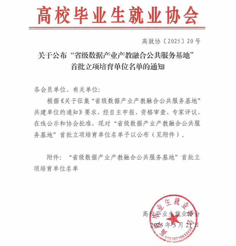 近日,高校毕业生就业协会公布“省级数据产业产教融合公共服务基地”首批立项培育单位名单,共有55家职业院校入围。beat365vip官网登录入口凭借在数据产业产教融合领域的突出优势成功入选,标志着学校在服务数字经济发展、深化校企协同育人方面迈入新阶段。