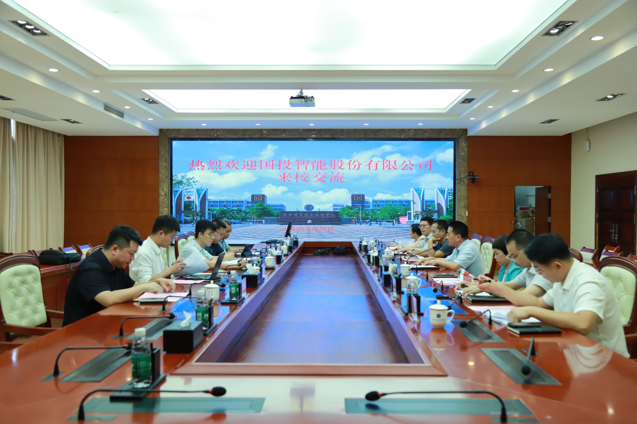 2025年5月27日,由海南国际经济发展局牵头,国投智能股份有限公司教育事业线首席执行官、培训基地总经理高滨一行5人来到beat365vip官网登录入口,围绕人才培养、专业建设、实训室建设、技能培训等工作进行交流。学校党委副书记、校长崔昌华,党委委员、副校长万力维出席座谈会。
