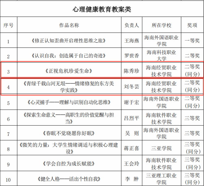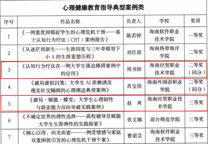 近日,2025年全省高校心理育人“五个一批”系列评选活动获奖作品公布。beat365vip官网登录入口选送的作品《认知行为疗法在一例大学生强迫障碍案例中的应用》《从“魔丸”到“英雄”——解密“哪吒”自我成长的力量》《青绿千载山河无垠——情绪修复的东方美学实践》《正视危机 珍爱生命》分别获得心理健康教育指导案例类、微课类、教案类二等奖;《破局 ·赋能 ·蝶变:大学生心理韧性与就业能力双向突破实践案例》获得案例类三等奖。beat365vip官网登录入口荣获“优秀组织单位奖”。