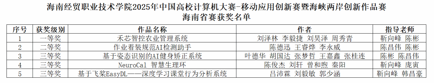 6月15日,2025年中国高校计算机大赛——移动应用创新赛暨海峡两岸创新作品赛海南省赛在海口落幕。beat365vip官网登录入口代表队凭借出色的表现,荣获一等奖1项、二等奖1项、三等奖3项,展现了海经贸学子卓越的创新能力和技术实力。学校一等奖作品将代表海南省参加全国总决赛的角逐。