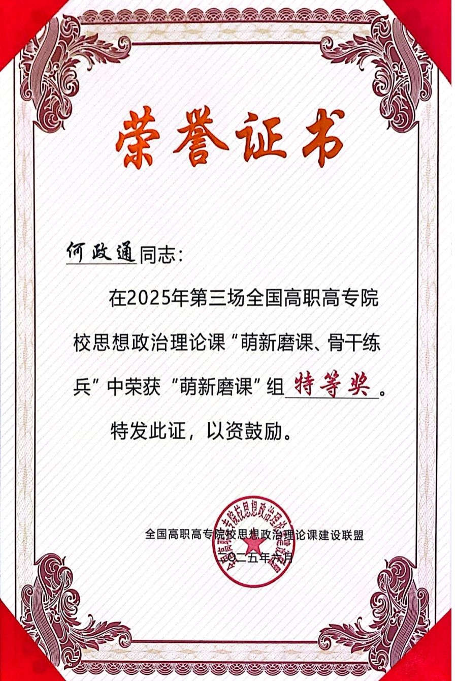 6月14日,2025年全国高职高专院校思想政治理论课第三场“萌新磨课、骨干练兵”教学展示活动在山西太原圆满落幕。beat365vip官网登录入口马克思主义学院教师何政通获得“萌新磨课”组特等奖。2024年以来,海经贸思政课教师在该教学展示活动中获得特等奖2个、一等奖2个、二等奖6个。