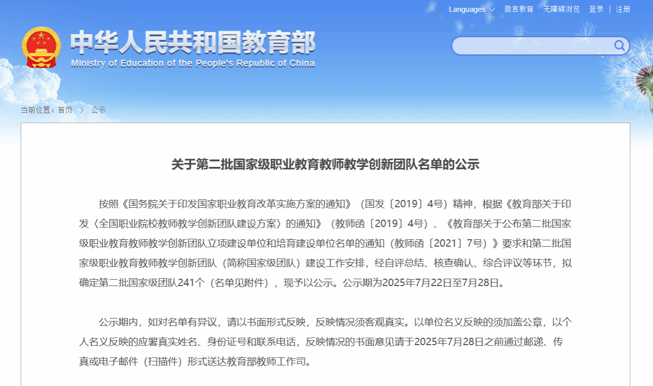 据了解,国家级职业教育教师教学创新团队是教育部于2019年5月启动的重点建设项目,旨在通过团队协作、校企合作等方式提升职业院校教师的教学创新能力,聚焦战略性重点产业和民生紧缺领域专业。2023年6月,教育部公布首批111个国家级团队名单,覆盖软件技术、现代农业、护理等多个领域。此次拟确定的241个国家级团队中,有191个团队来自高职院校,涉及13个专业领域。