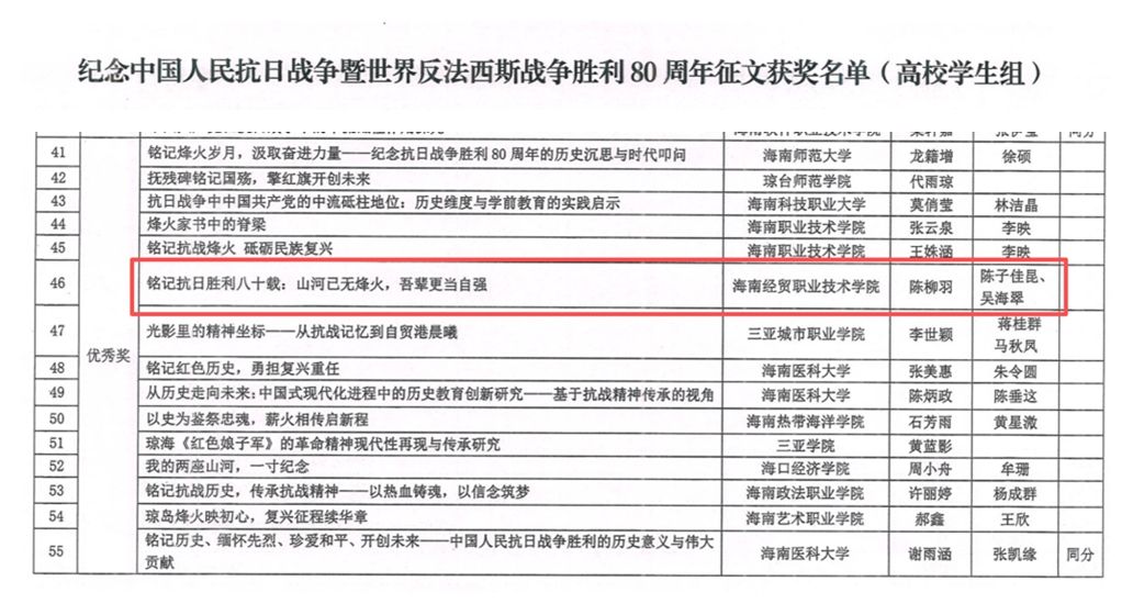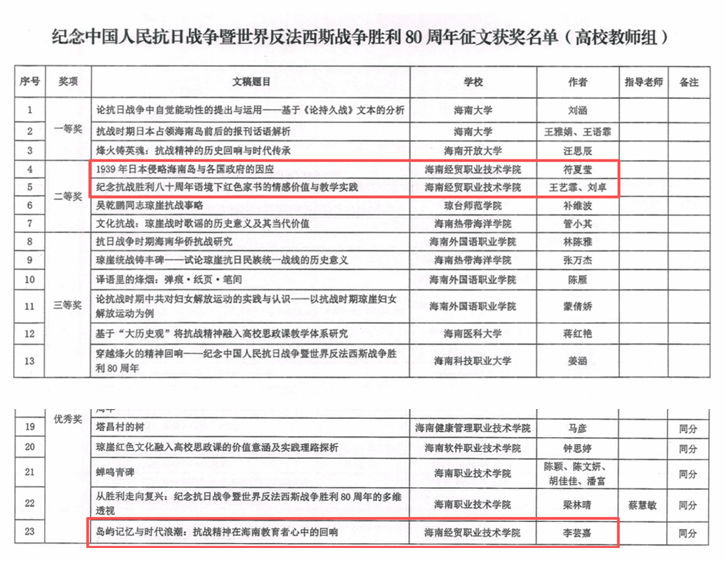 符夏莹老师的作品《1939年日本侵略海南岛与各国政府的因应》和王艺霏、刘卓老师的作品《纪念抗战胜利八十周年语境下红色家书的情感价值与教学实践》分别荣获高校教师组二等奖。李芸嘉老师的作品《岛屿记忆与时代浪潮:抗战精神在海南教育者心中的回响》荣获优秀奖;陈柳羽同学的作品《铭记抗日胜利八十载:山河已无烽火,吾辈更当自强》(指导教师:陈子佳昆、吴海翠)荣获高校学生组优秀奖。