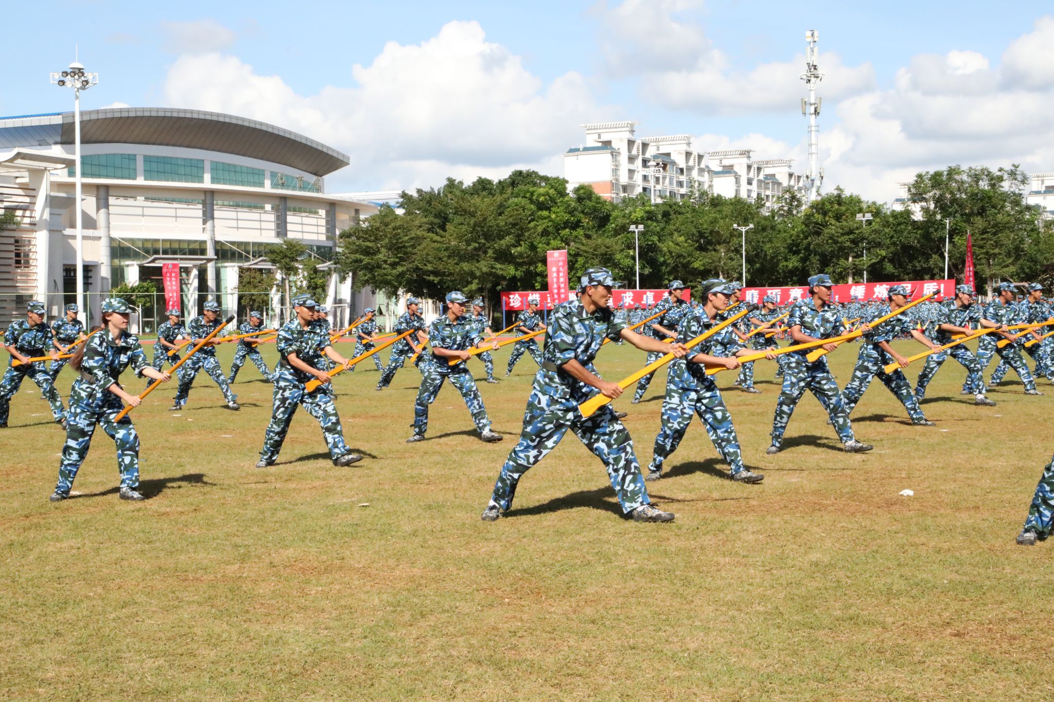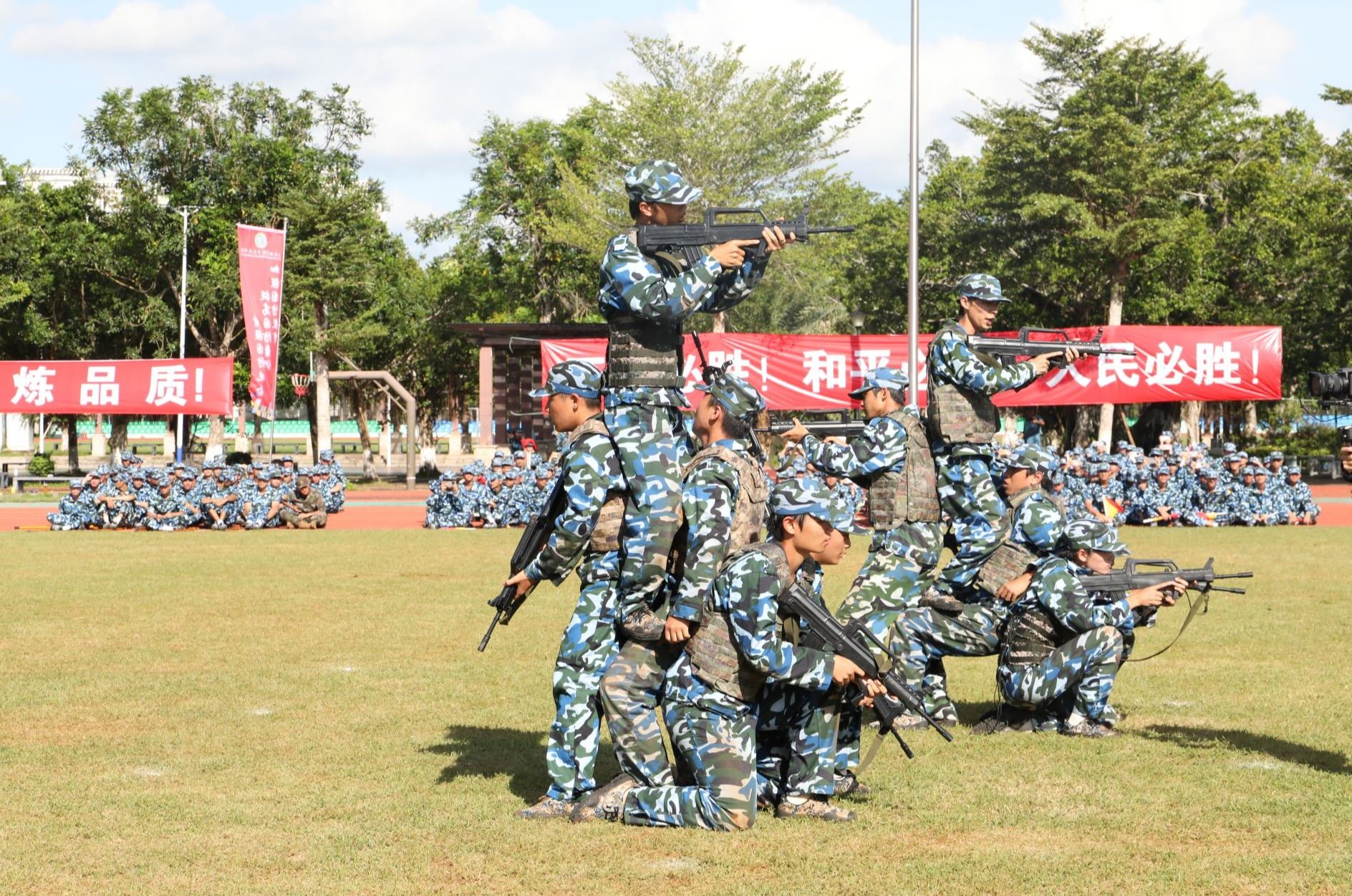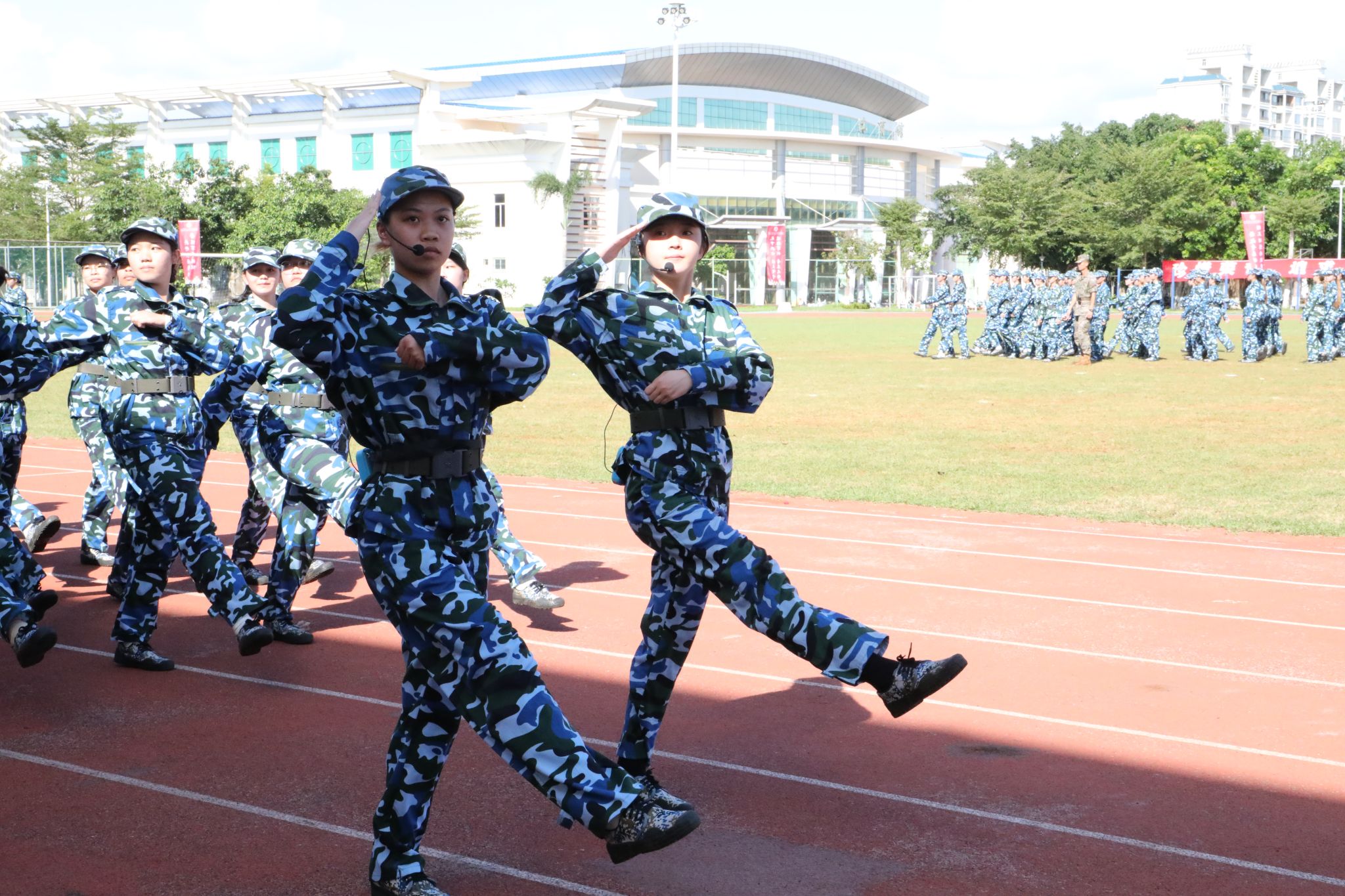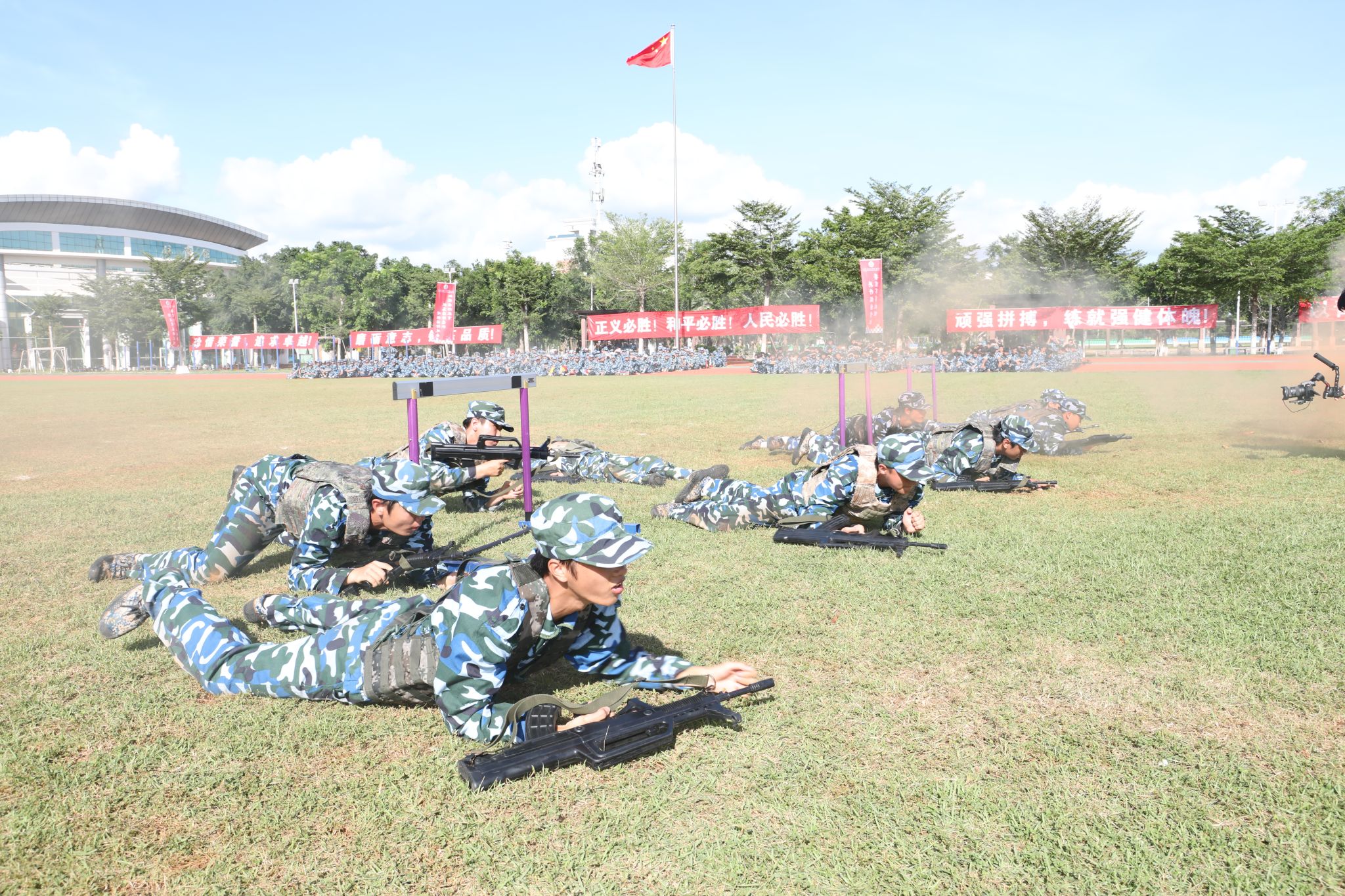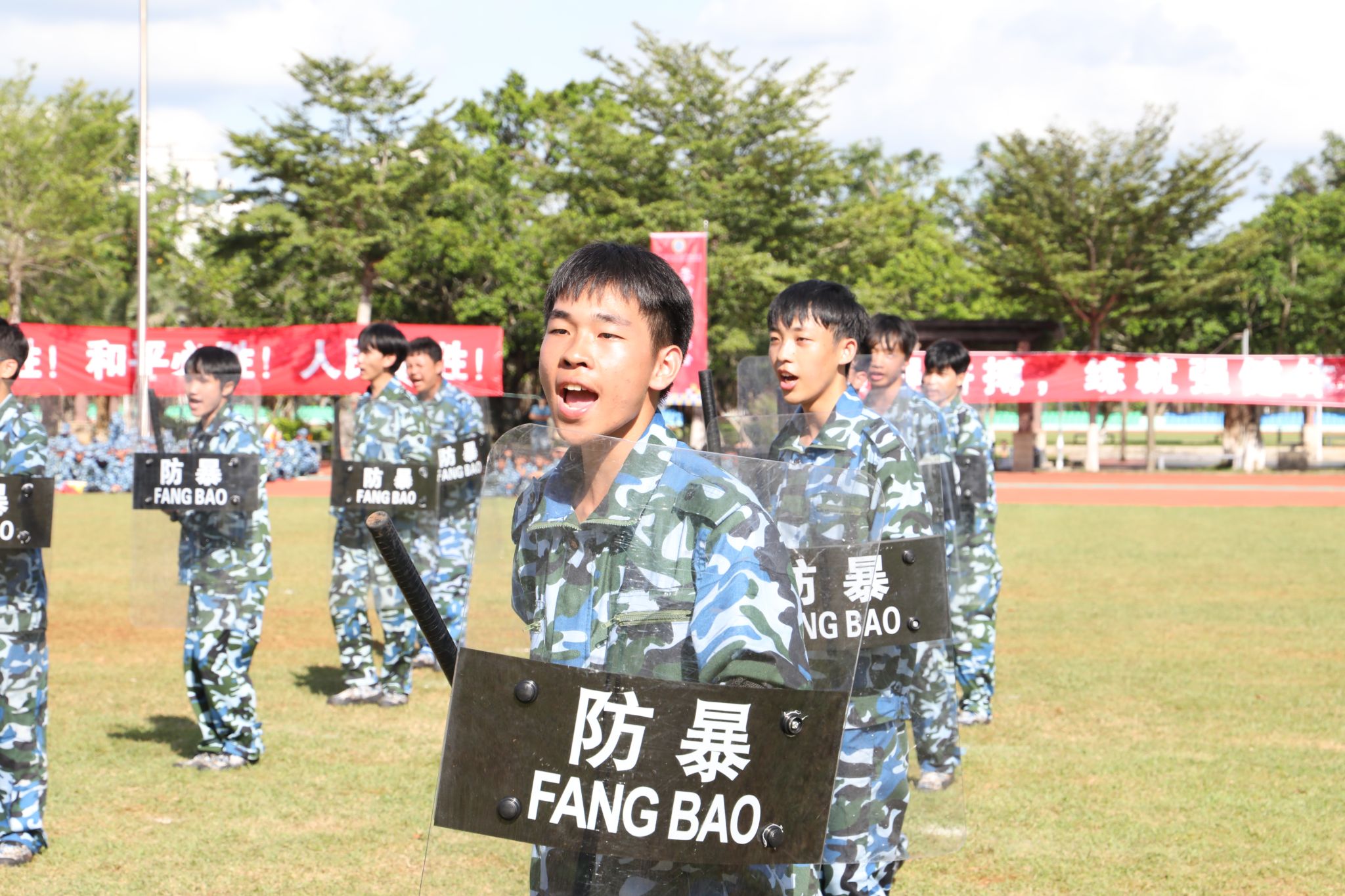 新生代表们还进行了刺杀操、旗语操、擒敌拳、警棍盾牌操、战术等军事科目操练。他们口号激昂响亮,动作整齐划一,气势磅礴雄伟,精彩表现赢得现场观众阵阵喝彩与掌声。