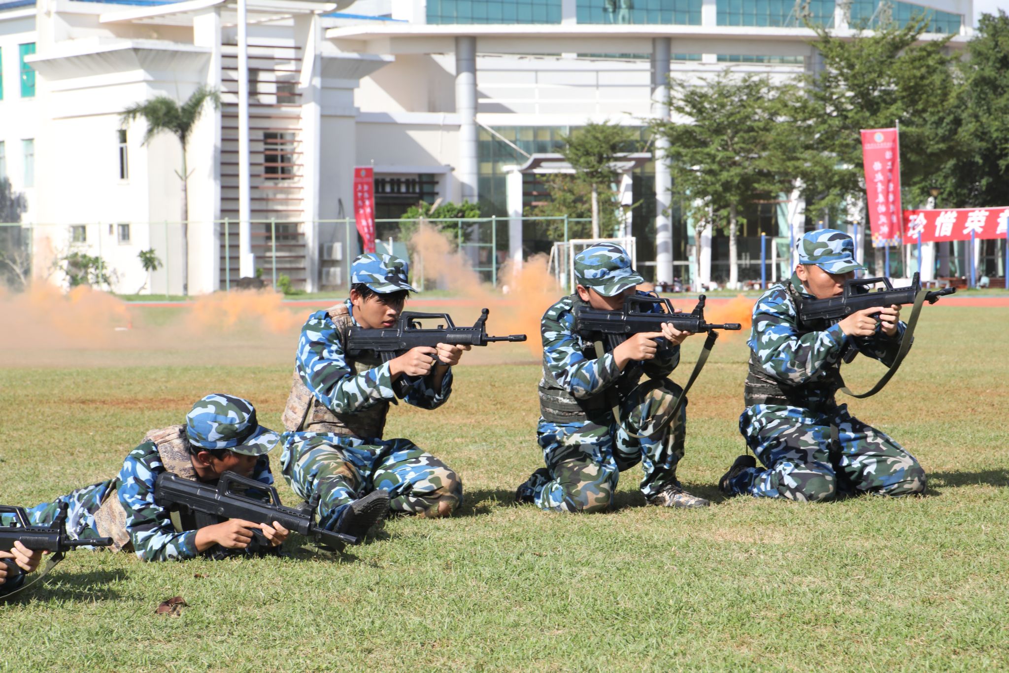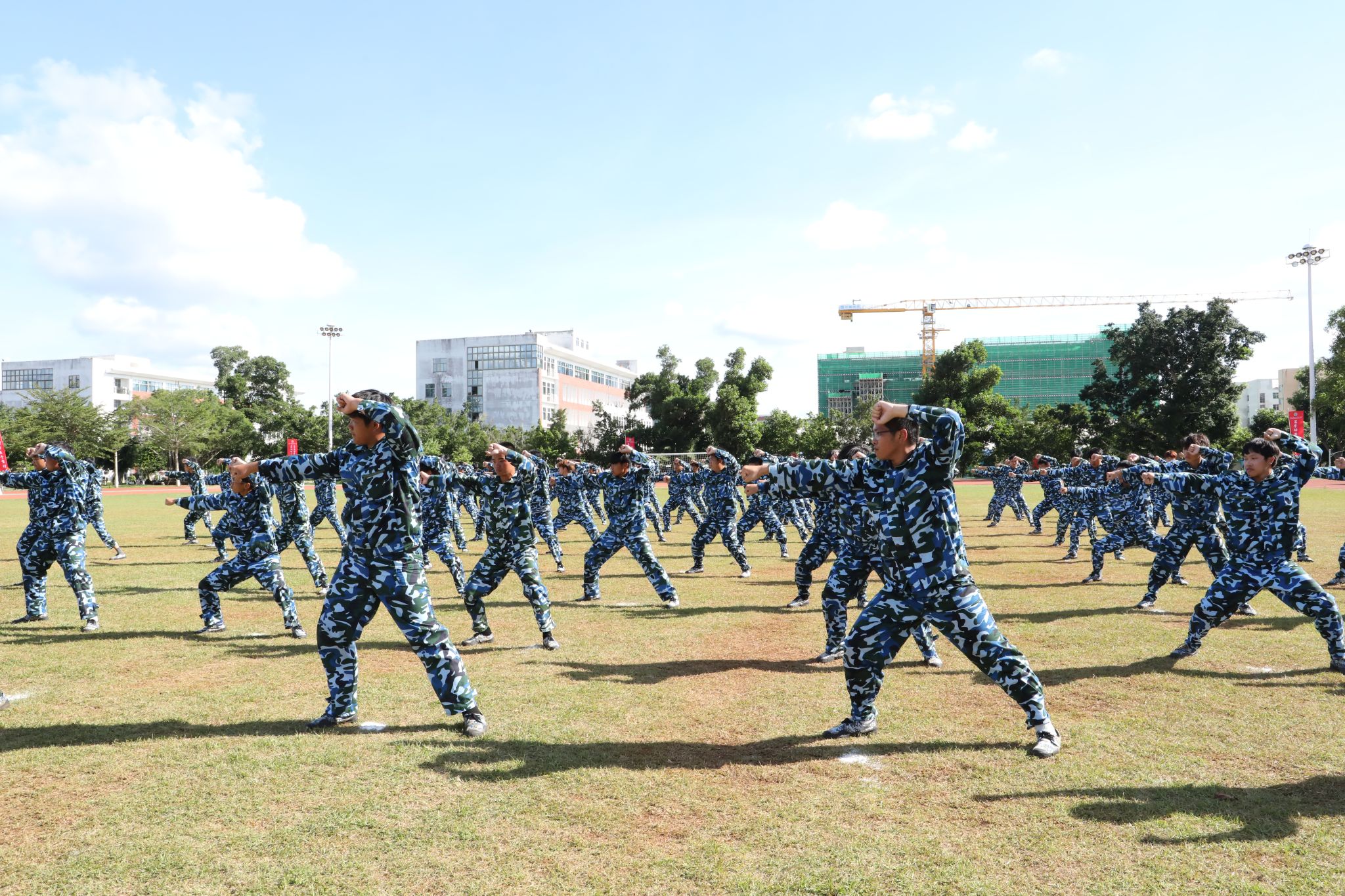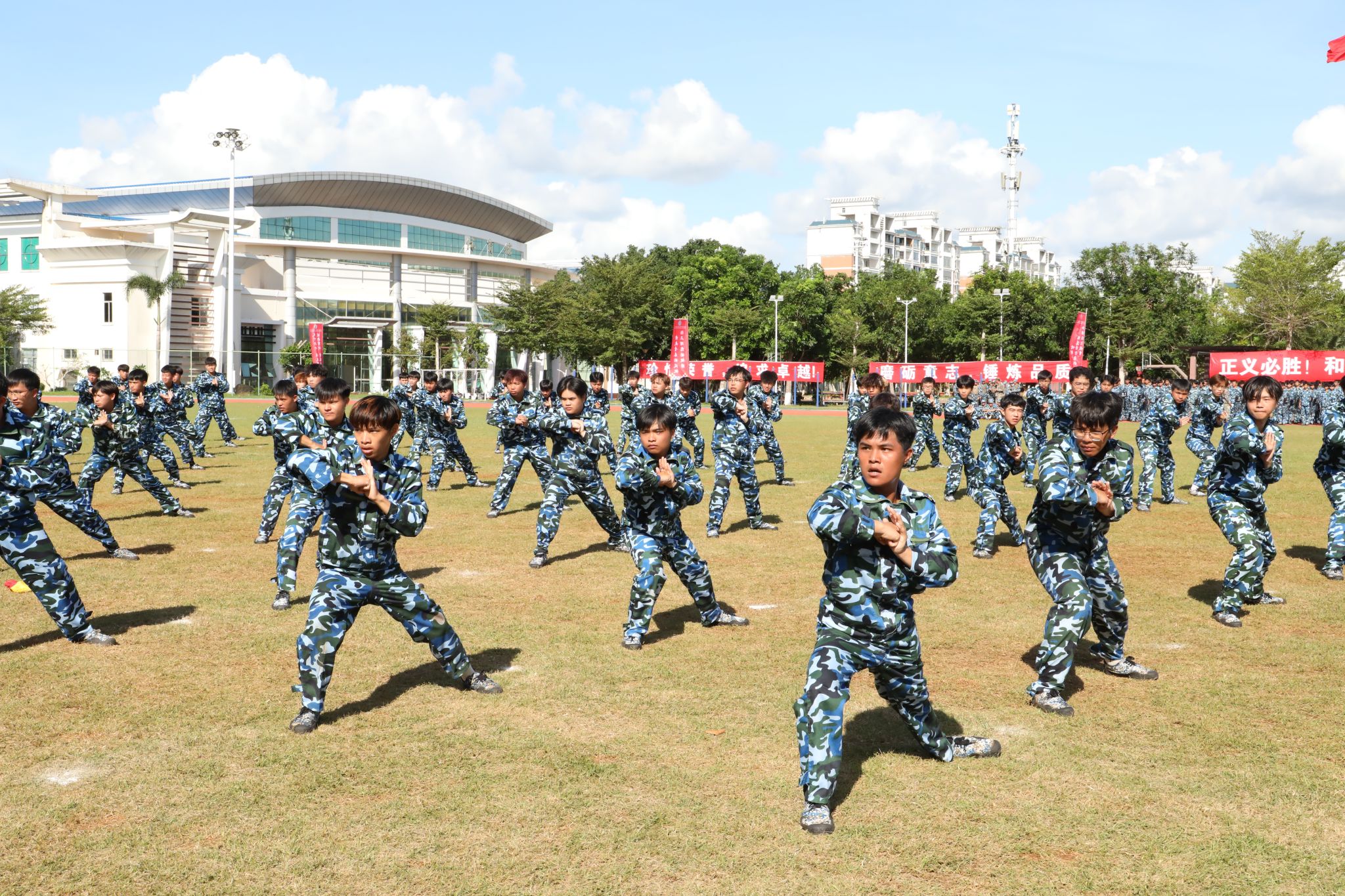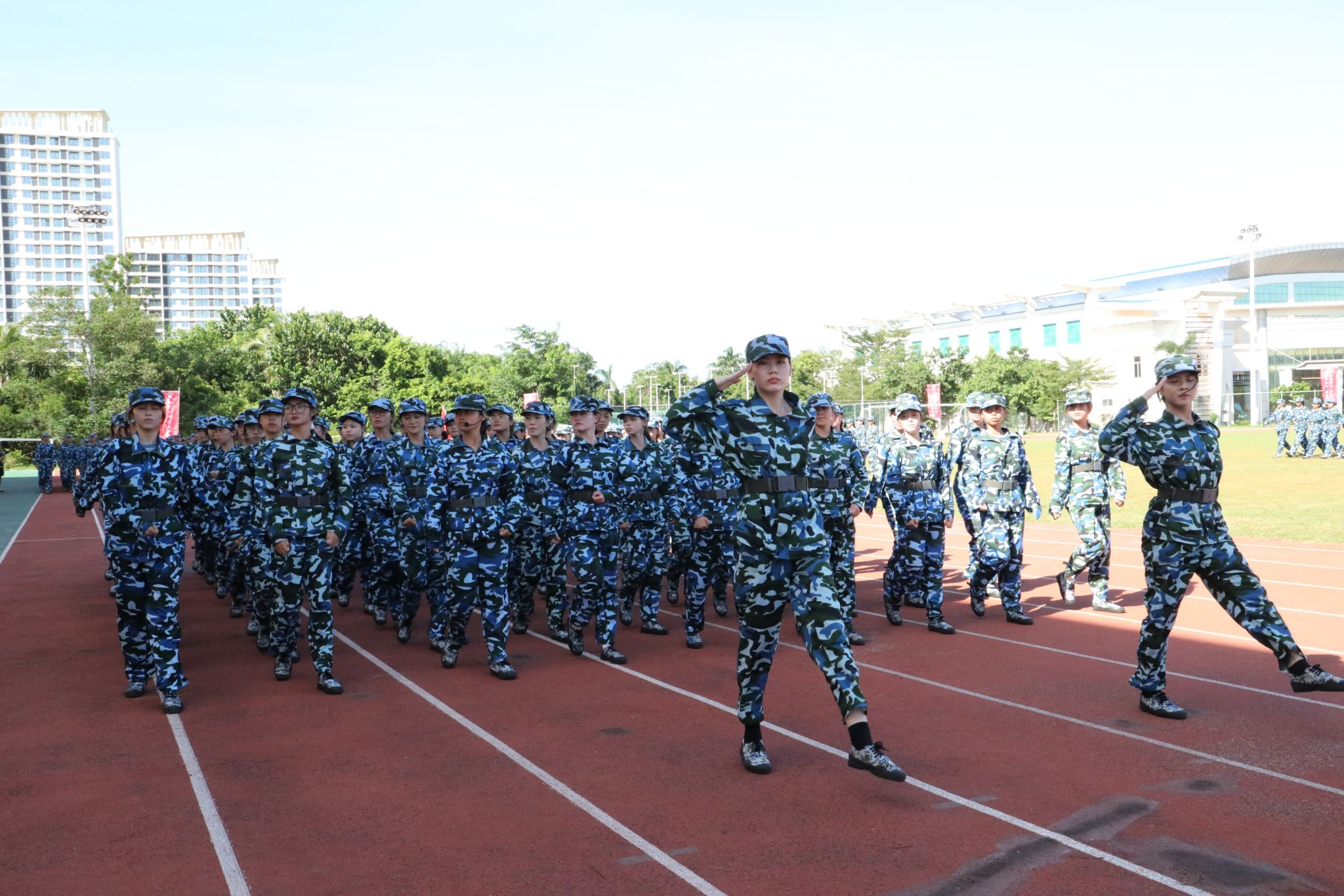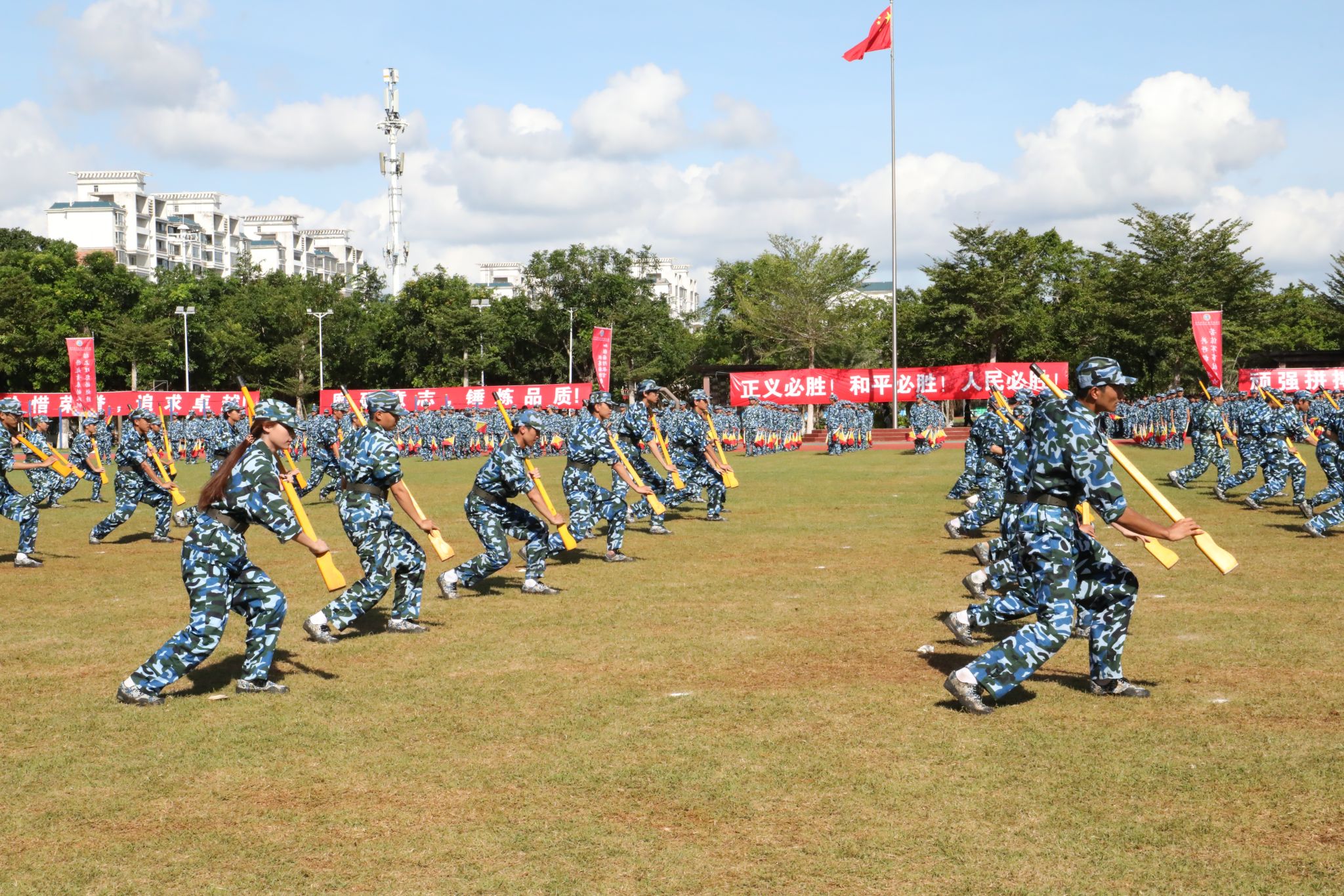 新生代表们还进行了刺杀操、旗语操、擒敌拳、警棍盾牌操、战术等军事科目操练。他们口号激昂响亮,动作整齐划一,气势磅礴雄伟,精彩表现赢得现场观众阵阵喝彩与掌声。