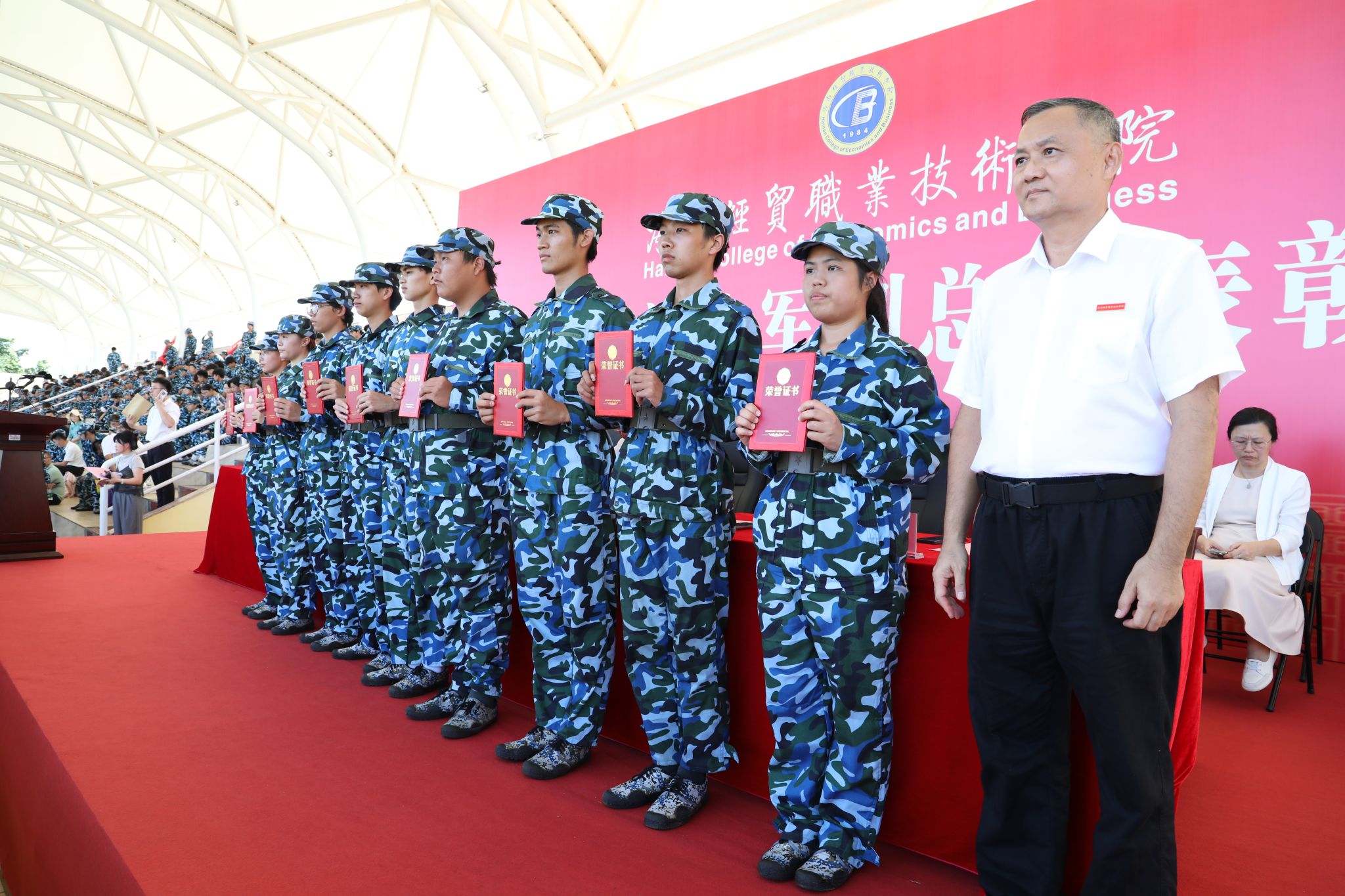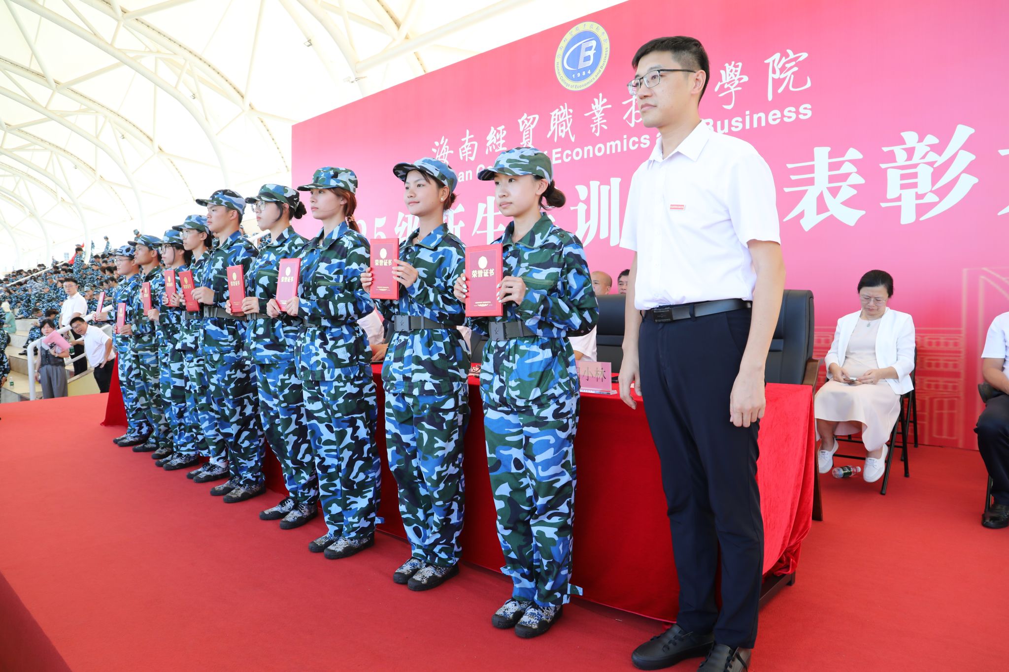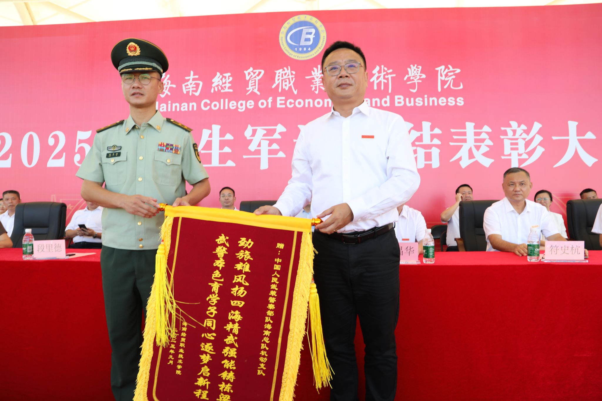 他深情寄语同学们,要传承“听党指挥”的军魂,筑牢理想信念的“根”与“魂”。将青春抱负融入服务国家战略、助力自贸港建设的时代洪流,做一名有理想、有担当、有格局的海经贸人。要发扬“能打胜仗”的作风,锤炼过硬本领的“技”与“能”。既要坐得住“冷板凳”,夯实理论基础,又要进得了“实训室”,练就过硬实操本领,努力成为知识结构优、实践能力好、创新意识强的高端技术技能人才。要永葆“作风优良”的传统,涵养团结协作的“和”与“美”。在服务社会中增长才干,努力成为人格健全、身心健康、全面发展的时代新人,用军训赋予自己的宝贵精神财富书写精彩人生华章。