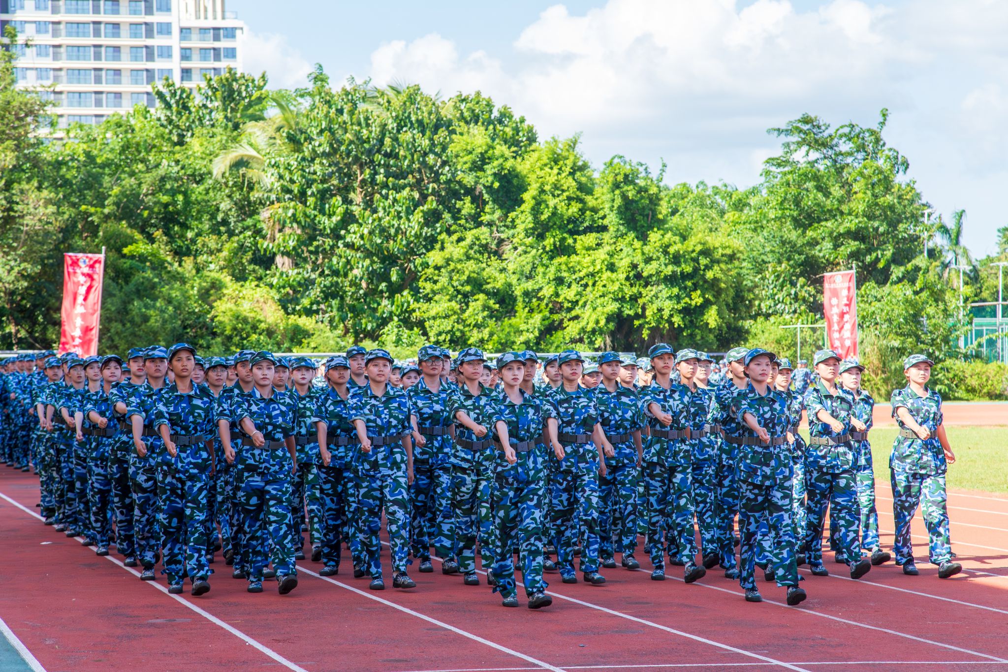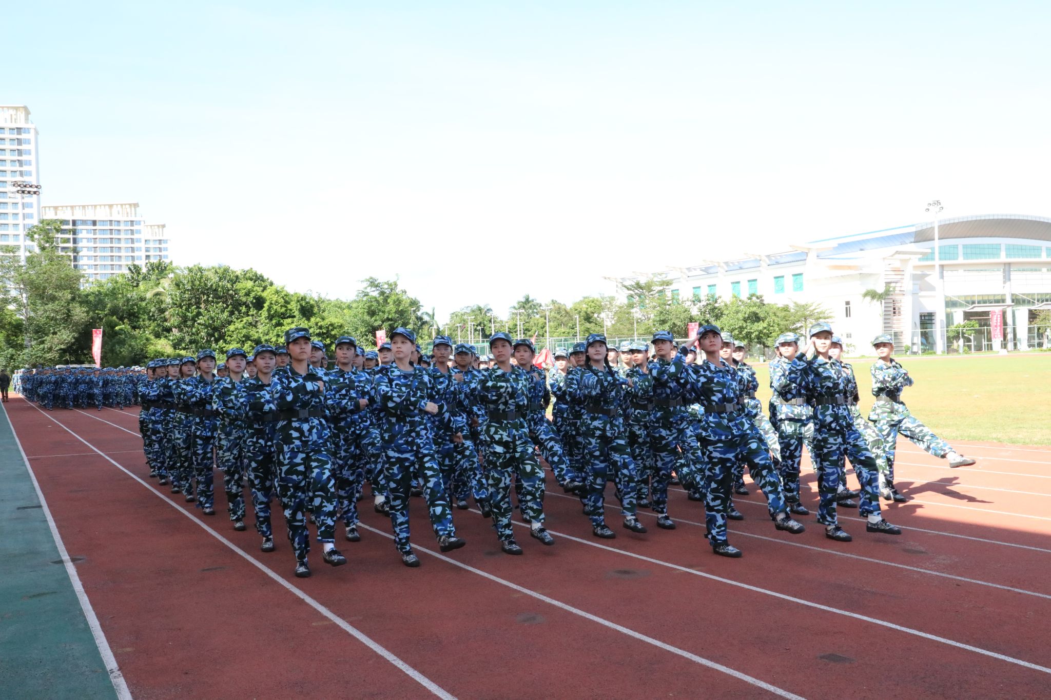 军歌嘹亮扬士气,口号震天聚锋芒;步伐铿锵承使命,身姿飒爽绽华章。伴随着激昂的进行曲,来自各二级学院的新生代表方队依次登场,以挺拔的姿态、整齐的正步走过主席台,接受检阅。标准的动作里,藏着连日来刻苦训练的汗水,尽显新时代青年不屈不挠的坚毅品格;昂扬的神情中,既有初入大学校园的朝气,更饱含着传承使命、不负韶华的坚定信念。这份凝聚在一起的集体荣誉感,如同点点星光汇聚成炬,在阳光下绽放出属于海经贸新生一代的青春华章。