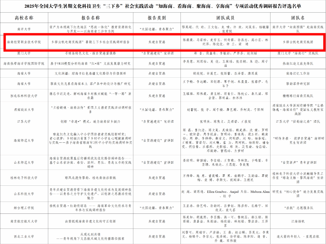 据悉,本次专项活动在共青团中央指导下,由共青团海南省委联合海南大学共同发起,旨在引导广大青年学生深入海南基层,实地感知自贸港建设成果,积极投身乡村振兴实践。活动吸引了全国众多高校踊跃参与,共有104支团队入围专项实践立项。经专家评审,最终评选出“优秀团队”9个、“优秀调研报告”16份、“优秀项目”9个。
