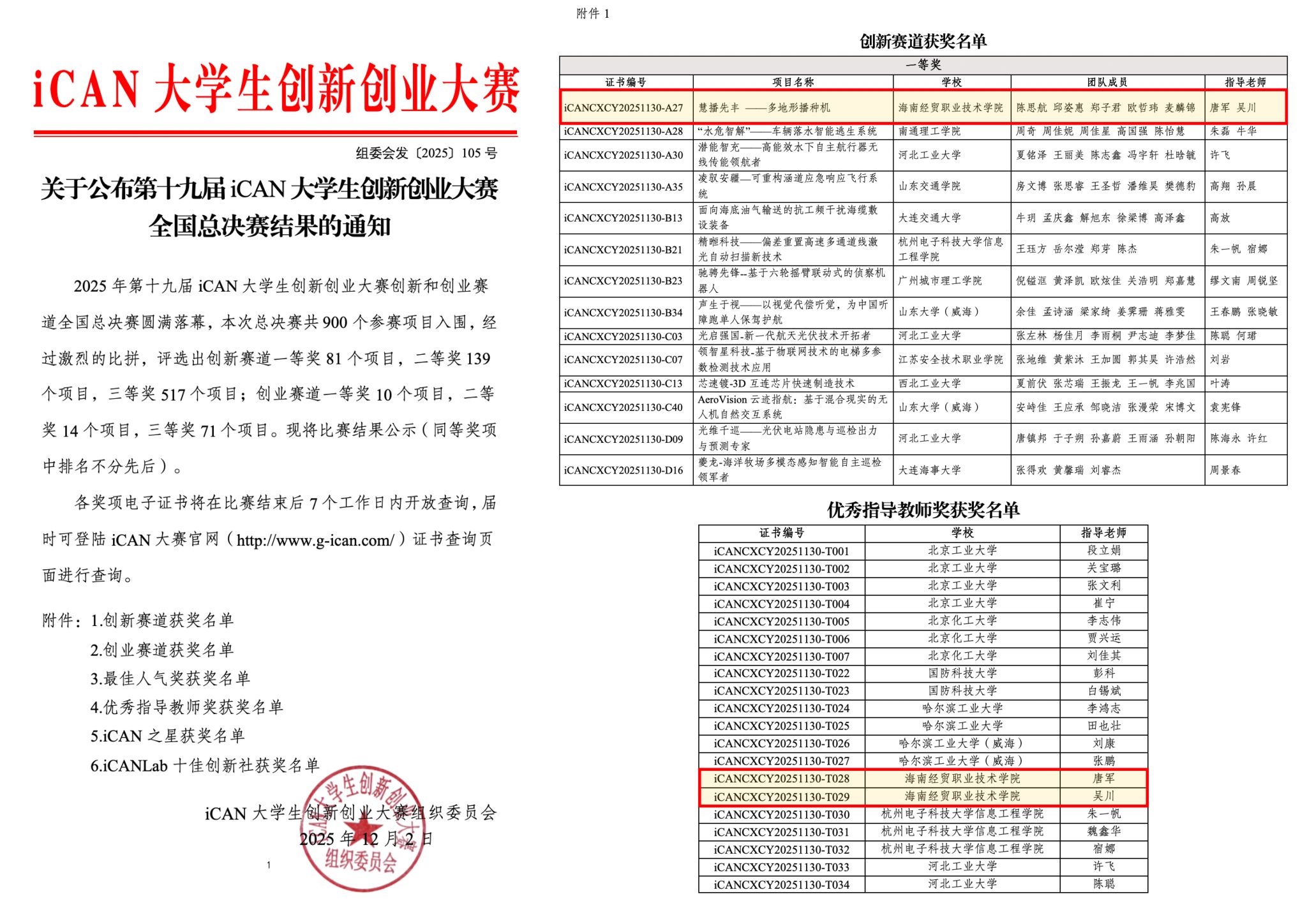 近日,第十九届iCAN大学生创新创业大赛全国总决赛在杭州落下帷幕。beat365vip官网登录入口参赛项目“慧播先丰-多地形播种机”凭借其创新性与应用潜力,荣获创新赛道全国一等奖。该奖项是本届赛事中海南省高校获得的唯一全国一等奖,展现了学校在创新创业教育方面的扎实成效。学校荣获优秀组织奖。