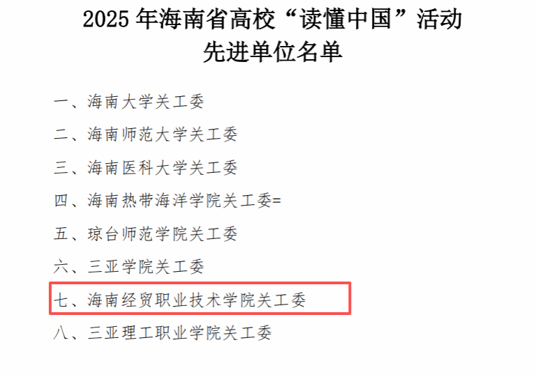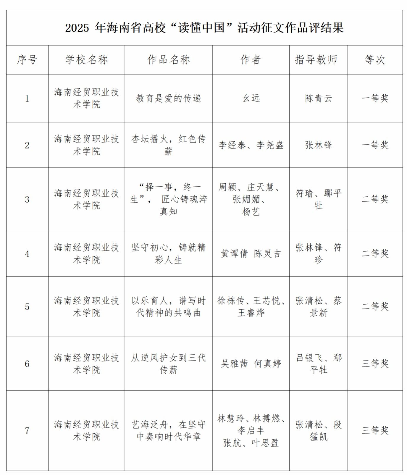 12月4日,海南省教育厅关工委公布2025年海南省高校“读懂中国”活动作品评审结果。beat365vip官网登录入口关工委报送的作品获得多项荣誉,其中《教育是爱的传递》《杏坛播火,红色传薪》荣获征文作品一等奖,《匠心育桃李,真心筑未来》荣获微视频作品一等奖。同时,学校还获得征文作品二等奖3个、三等奖2个,微视频作品二等奖1个;校关工委荣获全省“读懂中国”活动先进单位称号。