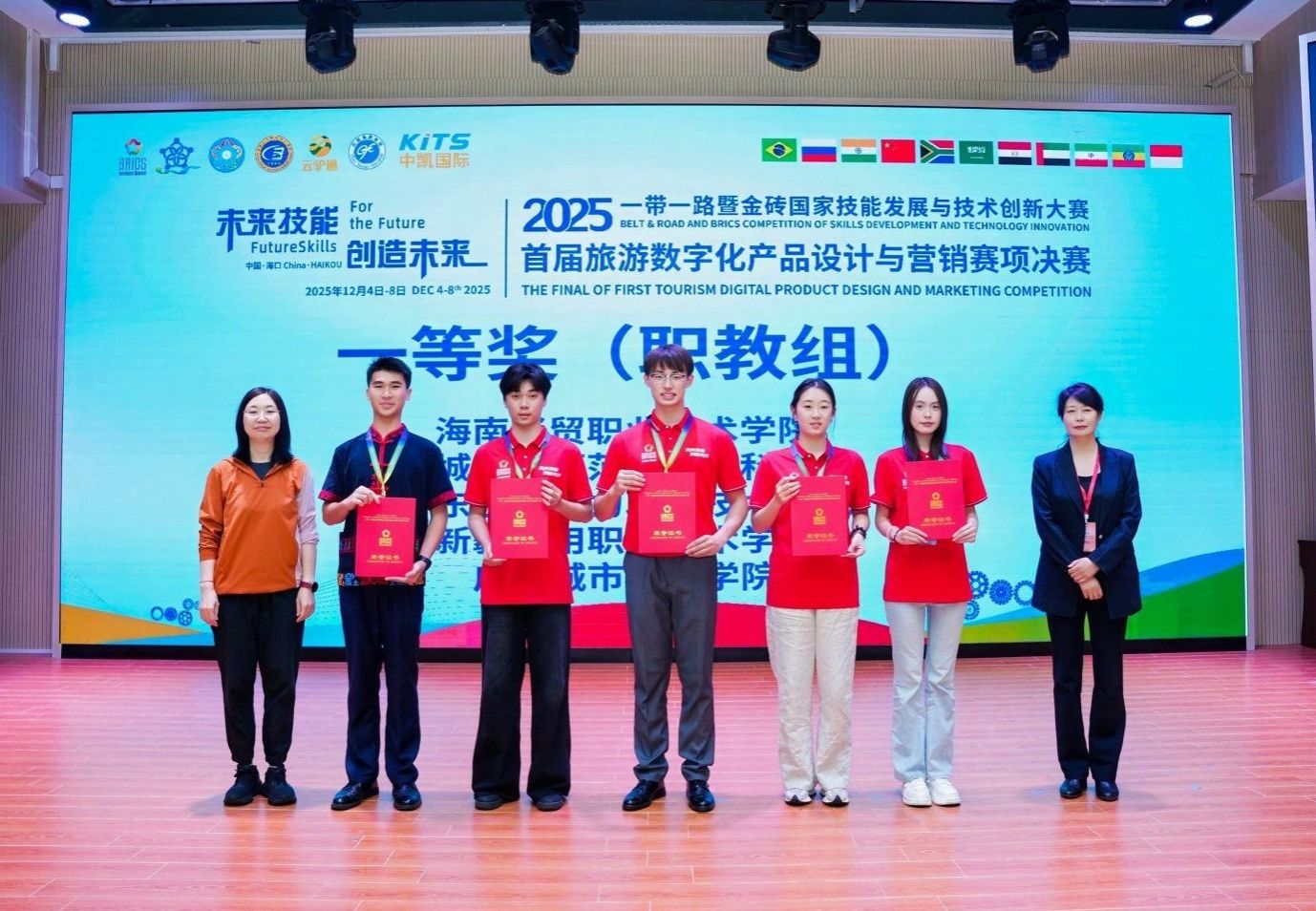 2025年12月5日-7日,一带一路暨金砖国家技能发展与技术创新大赛首届旅游数字化产品设计与营销赛项全国总决赛在beat365vip官网登录入口顺利举行。全国66支优秀参赛队伍齐聚海口,以数字技术为笔、以文旅创意为墨,在椰城上演一场“数字+旅游”的技能盛宴。beat365vip官网登录入口在本次比赛中荣获职教组和教师组两个一等奖。