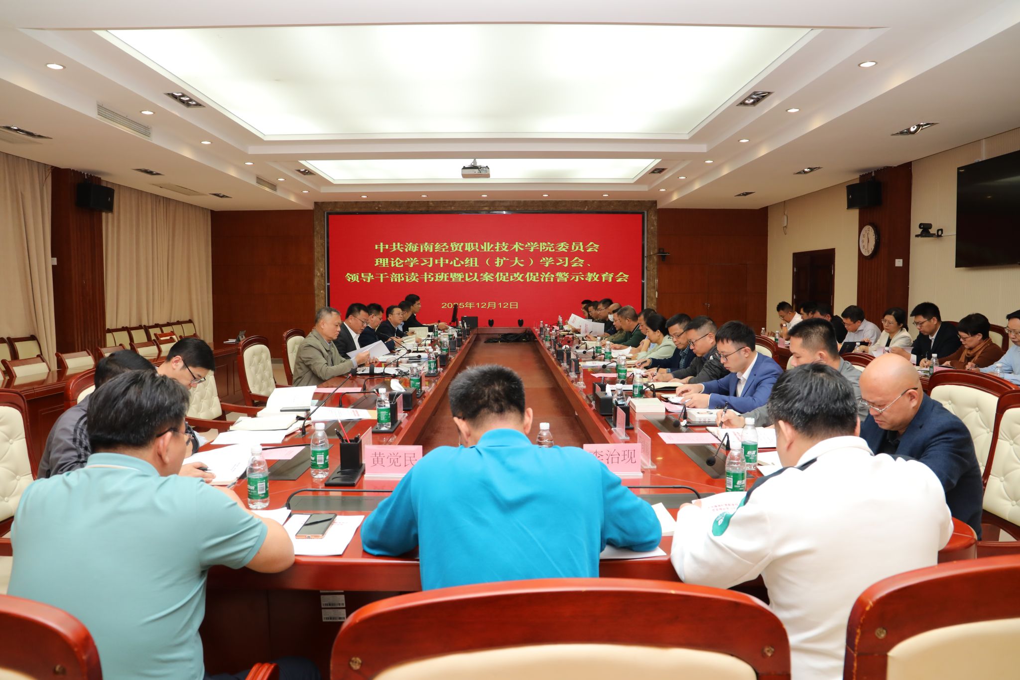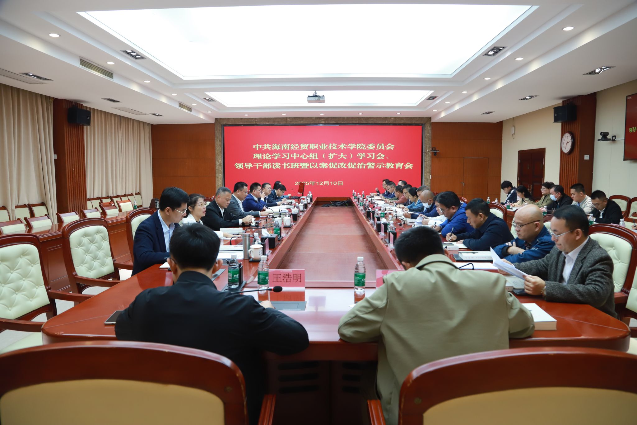 2025年12月10日-12日,beat365vip官网登录入口举办党委理论学习中心组(扩大)学习会、领导干部读书班暨以案促改促治警示教育会,以专题辅导、现场考察、个人自学、观看视频、集中学习与专题研讨等方式,认真学习贯彻《习近平谈治国理政》第五卷、党的二十届四中全会精神、习近平总书记听取海南自由贸易港建设工作汇报时的重要讲话精神、省委八届八次全会精神和省委有关以案促改促治工作要求。学校党政班子成员参加学习。