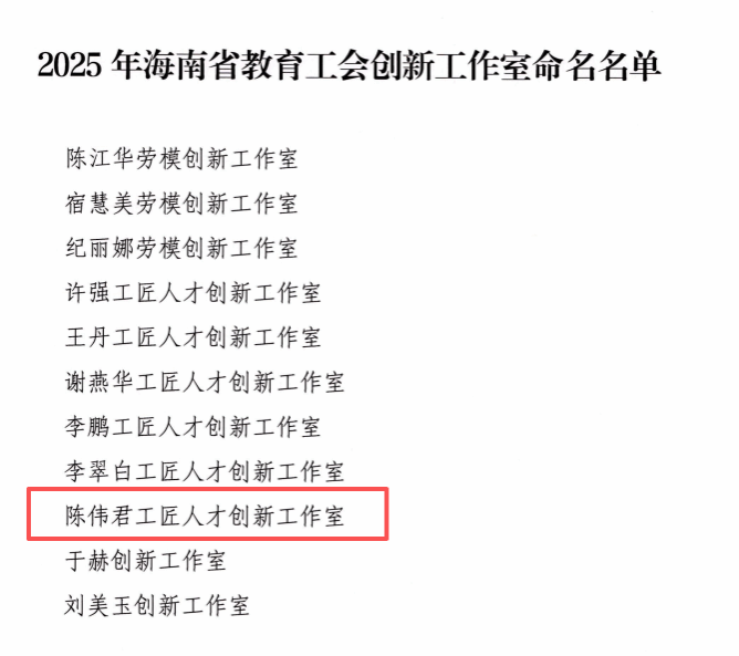 近日,海南省教育工会公布2025年省教育工会创新工作室命名结果,beat365vip官网登录入口陈伟君工匠人才创新工作室被命名为“海南省教育工会劳模与工匠人才创新工作室”。