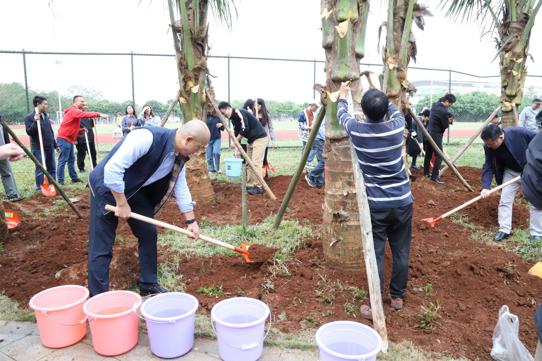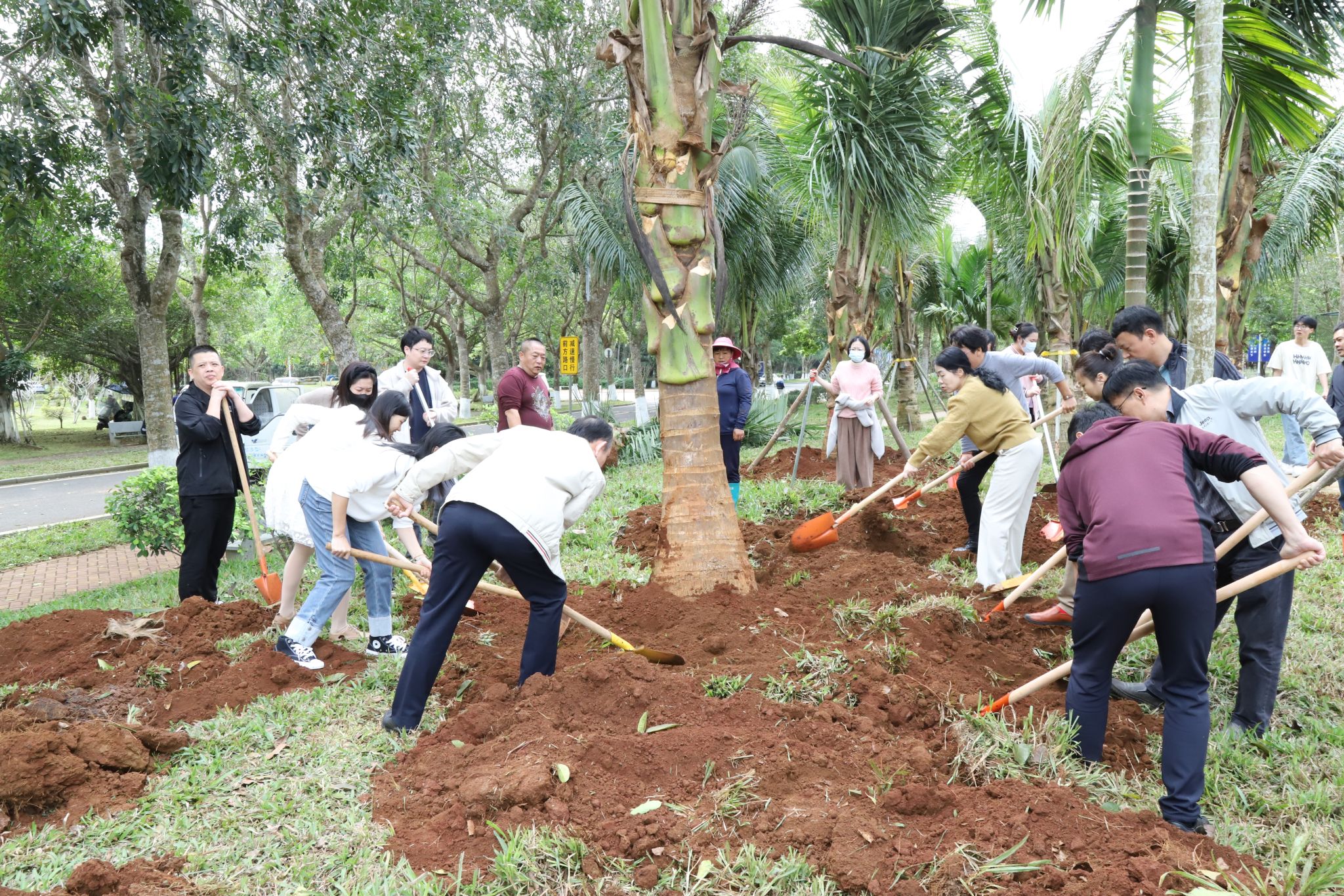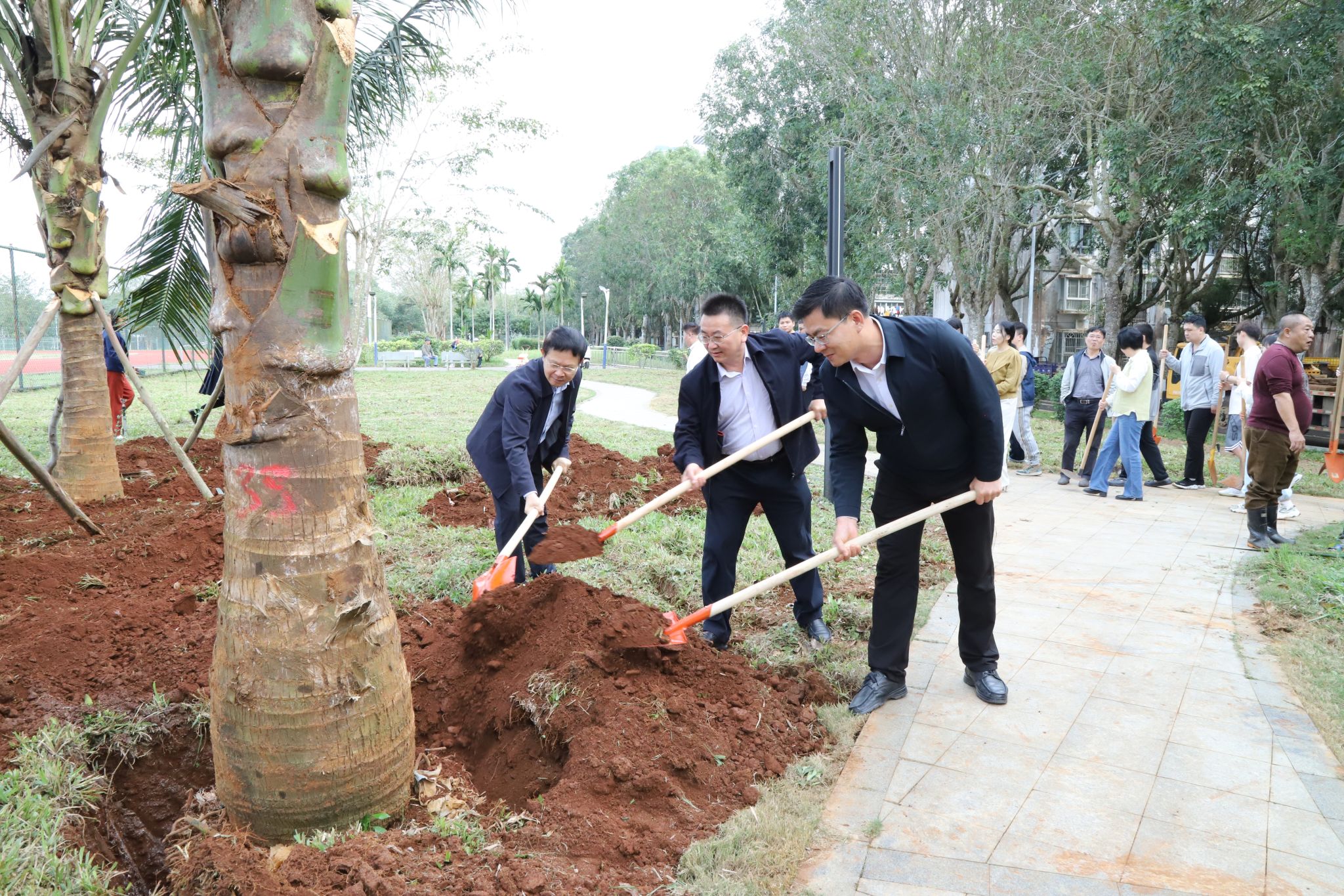 上午10时左右,大家齐聚于教职工宿舍与运动场之间的绿地。工作人员将椰子树苗稳妥地安置在预先准备好的位置上,大家齐心协力,挥动铁锹铲土、筑起围堰、提水浇灌、各司其职,十多棵椰子树在众人的共同努力下,稳固地扎根于土壤之中,傲然挺立,迎风摇曳,展现出勃勃生机。“你是我们种下的,要健康长高长壮哈!”老师和同学们和亲手种下的椰子树“对话”。此次植树活动既是对师生员工的一次生态文明理念教育,更是一次人与自然的亲切交流,是大家对未来希望的共同播种。