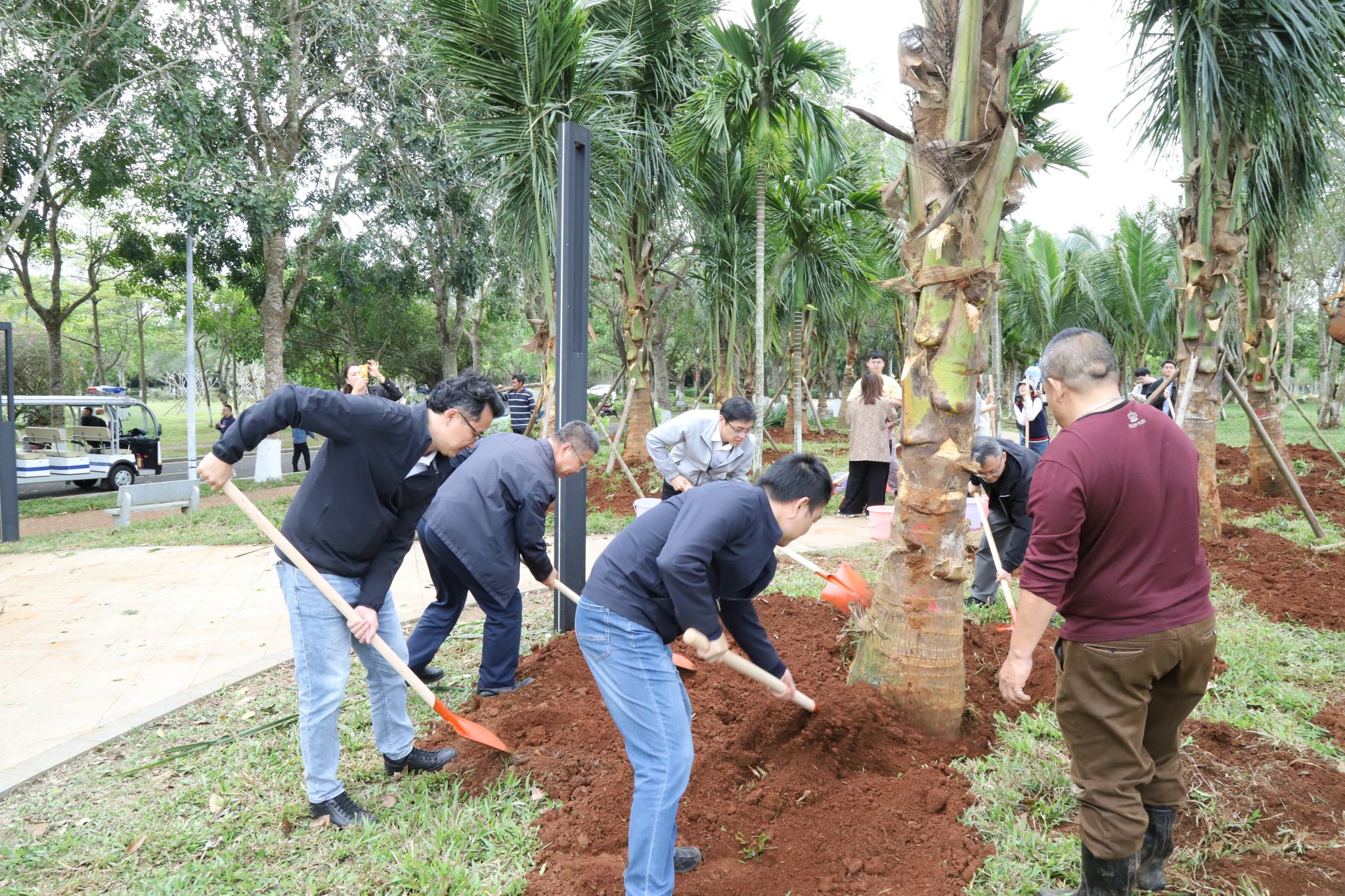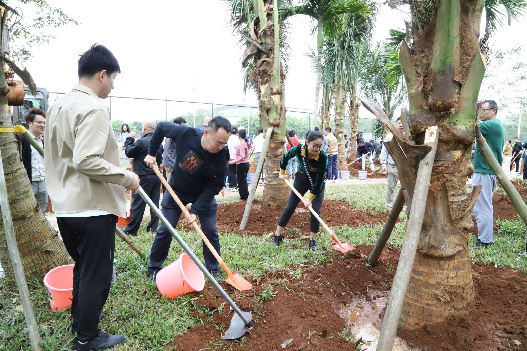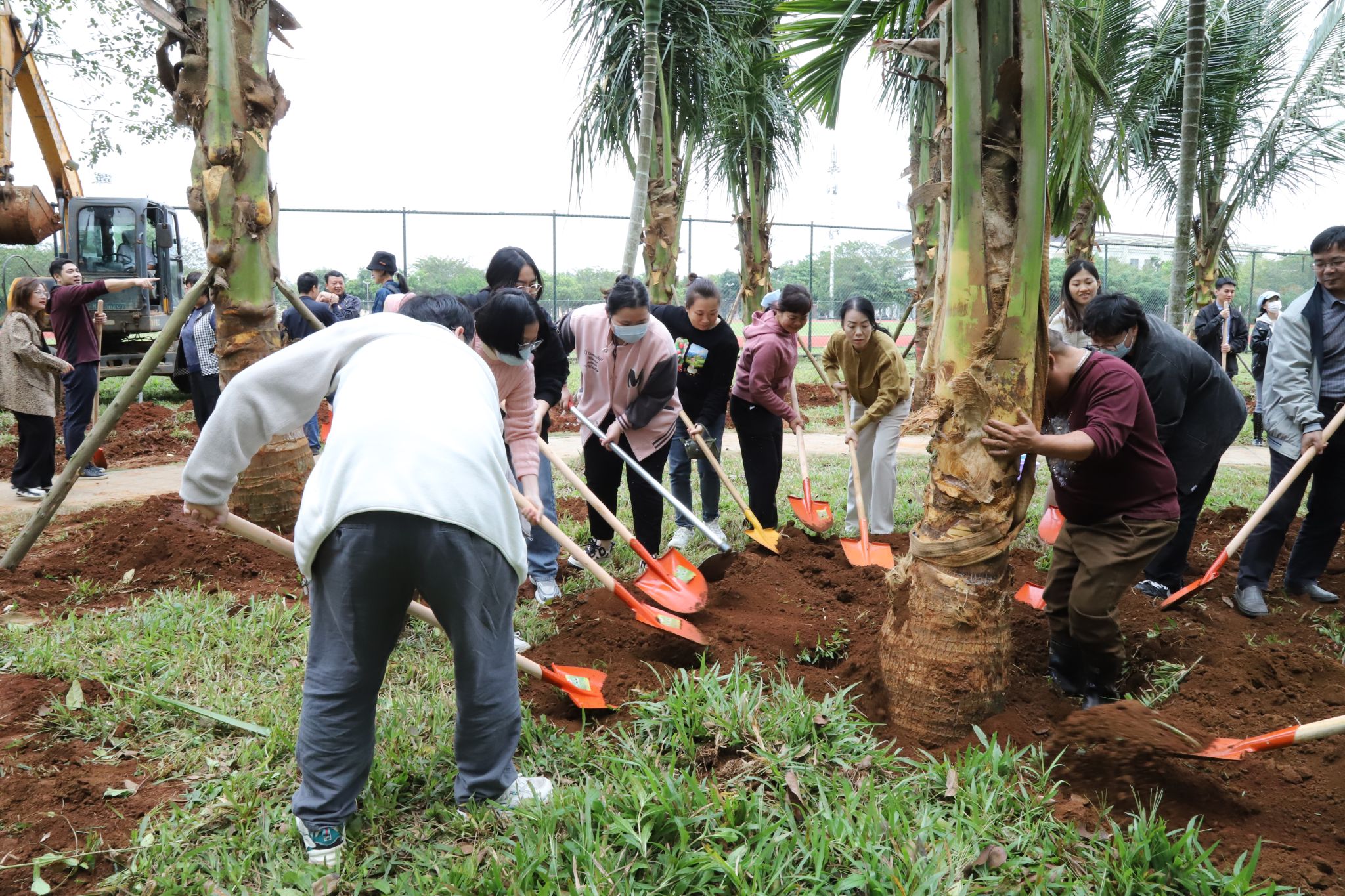 上午10时左右,大家齐聚于教职工宿舍与运动场之间的绿地。工作人员将椰子树苗稳妥地安置在预先准备好的位置上,大家齐心协力,挥动铁锹铲土、筑起围堰、提水浇灌、各司其职,十多棵椰子树在众人的共同努力下,稳固地扎根于土壤之中,傲然挺立,迎风摇曳,展现出勃勃生机。“你是我们种下的,要健康长高长壮哈!”老师和同学们和亲手种下的椰子树“对话”。此次植树活动既是对师生员工的一次生态文明理念教育,更是一次人与自然的亲切交流,是大家对未来希望的共同播种。