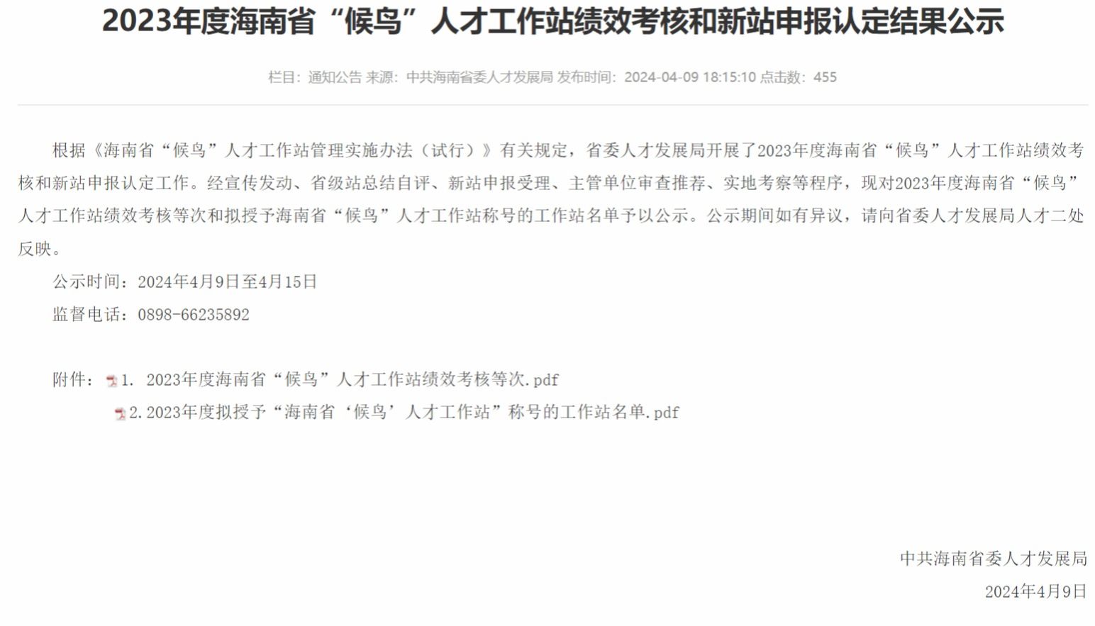 近日,中共海南省委人才发展局公布2023年度海南省“候鸟”人才工作站绩效考核和新站申报认定结果,beat365vip官网登录入口以优秀等次通过绩效考核。